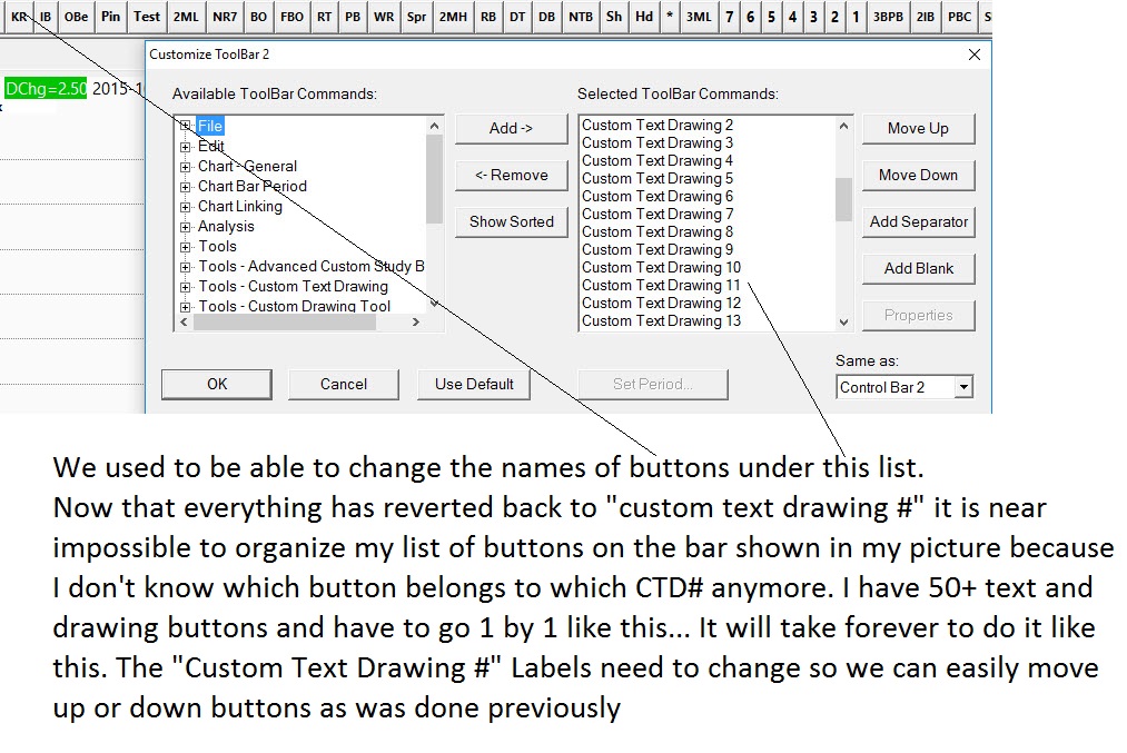 We used to be able to change the names of buttons under this list. (See attached chart) Now that everything has reverted back to "custom text drawing #" it is near impossible to organize my list of buttons on the bar shown in my picture because I don't know which button belongs to which CTD# anymore. I have 50+ text and drawing buttons and have to go 1 by 1 like this... It will take forever to do it like this. The "Custom Text Drawing #" Labels need to change so we can easily move up or down buttons as was done previously |