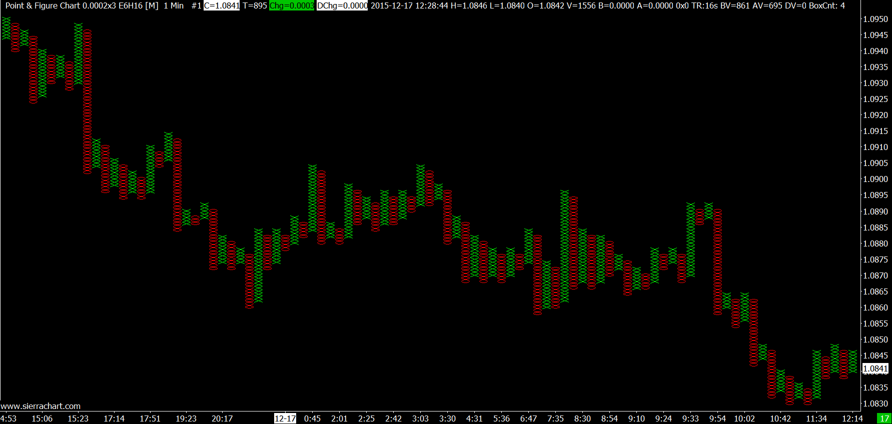 Remove the Point and Figure chart study from the chart posted in #6. Do the underlying prices look correct? We opened a chart, added the Point and Figure chart study, set it up as you have and changed the symbol of the chart to the 6E and it displayed properly: http://www.sierrachart.com/image.php?l=1450377555700.png We see no reason for a problem. This probably will not make any difference but update to the latest prerelease of Sierra Chart. Sierra Chart Support - Engineering Level Your definitive source for support. Other responses are from users. Try to keep your questions brief and to the point. Be aware of support policy: https://www.sierrachart.com/index.php?l=PostingInformation.php#GeneralInformation For the most reliable, advanced, and zero cost futures order routing, *change* to the Teton service: Sierra Chart Teton Futures Order Routing Date Time Of Last Edit: 2015-12-17 19:51:46