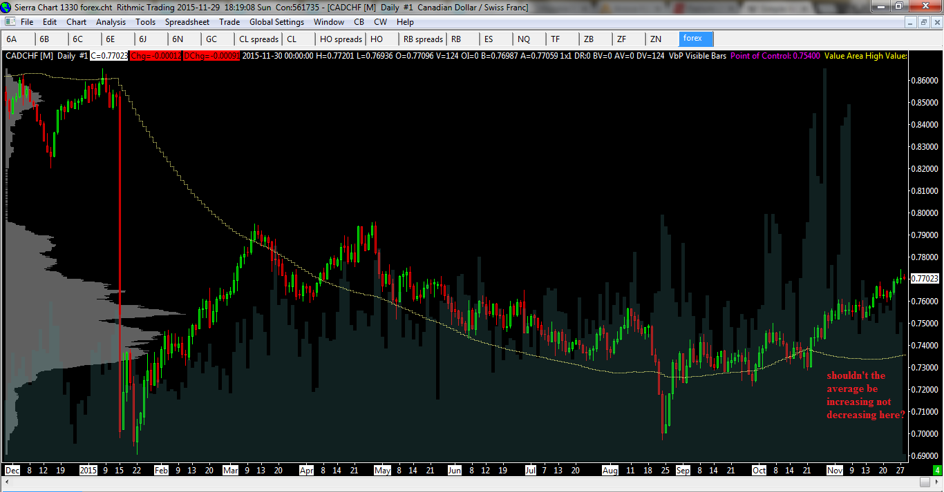 The calculation is going to work consistently at every bar. We think the calculation is being affected by the bars around the large price decline. With a Length input setting of 200 are those bars around the large decline included in the calculation? Sierra Chart Support - Engineering Level Your definitive source for support. Other responses are from users. Try to keep your questions brief and to the point. Be aware of support policy: https://www.sierrachart.com/index.php?l=PostingInformation.php#GeneralInformation For the most reliable, advanced, and zero cost futures order routing, *change* to the Teton service: Sierra Chart Teton Futures Order Routing Date Time Of Last Edit: 2015-11-30 03:01:49