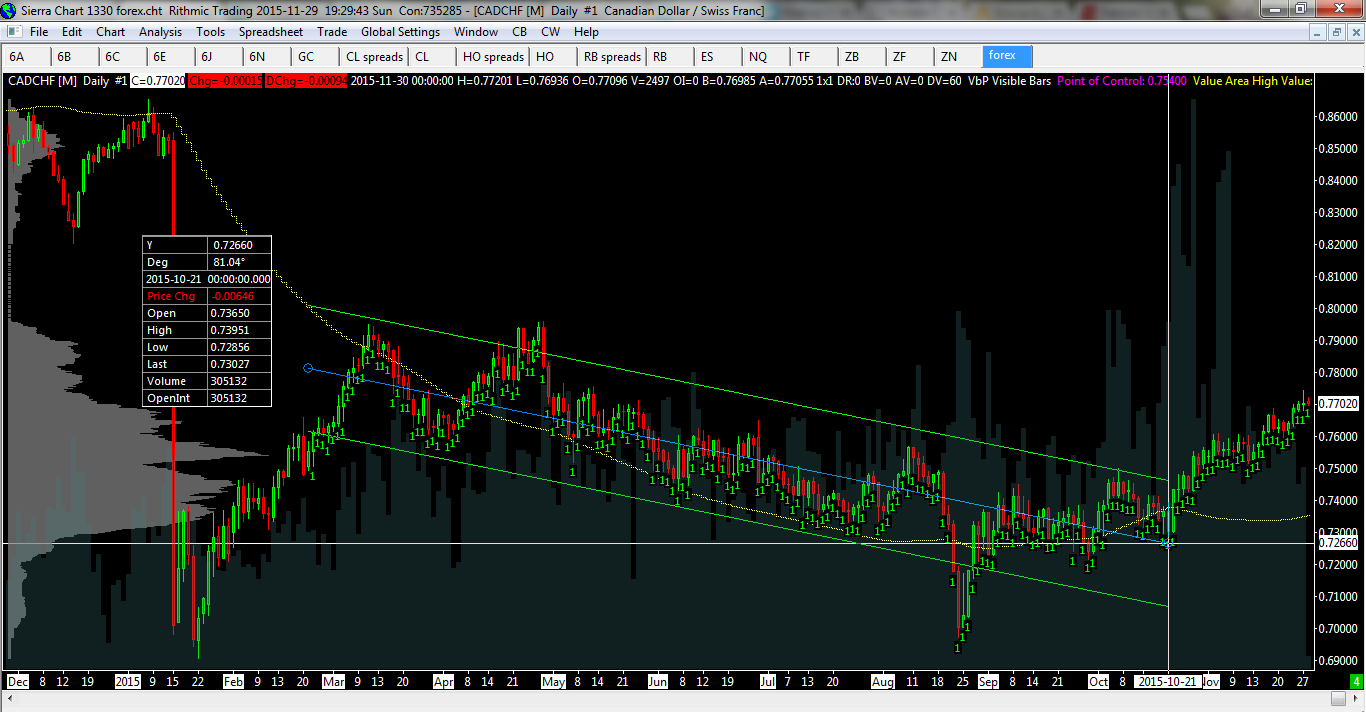 I'm using the Moving Linear Regression study with a period of 200 based on the LAST price on a daily chart of CADCHF which goes back farther than 200 days. I noticed over the last 20-30 bars it appears that the Moving Linear Regression is not being calculated properly. Starting on 10/22/2015 CADCHF begins increasing, but the moving average begins decreasing. I don't believe this is correct. See attached.