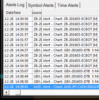 There could be filters for Alert Type, Symbol, chart, Date-Time range. We could add some of this. Sierra Chart Support - Engineering Level Your definitive source for support. Other responses are from users. Try to keep your questions brief and to the point. Be aware of support policy: https://www.sierrachart.com/index.php?l=PostingInformation.php#GeneralInformation For the most reliable, advanced, and zero cost futures order routing, *change* to the Teton service: Sierra Chart Teton Futures Order Routing Date Time Of Last Edit: 2015-12-30 06:59:02