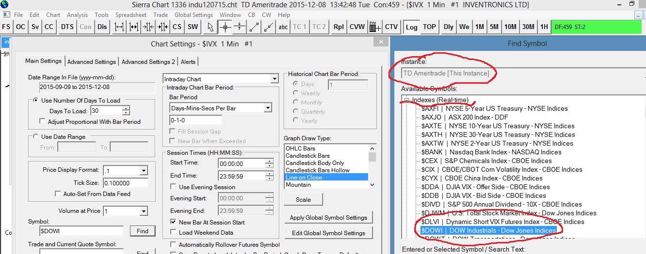 I have updated sierra software to newest version and noticed symbol has changed from INDU-I-NYSE to $DOWI. After logging in, quotes are delayed 10 mins and not updating. Where am I making a mistake? HD Request # 9 | Intraday download COMPLETE for $DOWI. Completion time: 4s. Unique request ID: 8 | 2015-12-07 11:53:25 Removed historical data download ID 8 | 2015-12-07 11:53:25 Real-time Intraday chart data file updates started for $DOWI | 2015-12-07 11:53:25 TD Ameritrade | Streamer response: STREAMER_SERVER_ID. Additional text: 03-4 | 2015-12-07 11:53:25 |