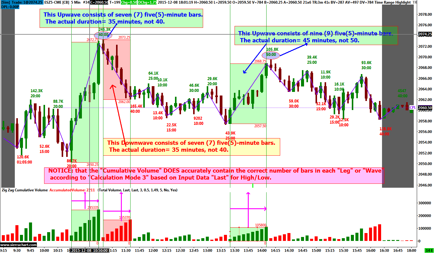 I use the Zig-Zag Study and the Zig-Zag Cumulative Volume studies, both with Settings: Calculation Mode 3; Input for High/Low = Last, Last; Calculate New Values on bar close = yes; Volume to Accumulate= Total volume; Display ZZ Volume=Yes; Display ZZ Time Duration= Yes. This very nicely creates "legs" or "Waves" exactly the way I wish to display them. However, even though the correct number of bars are accurately "contained" for each "Leg/Wave", the "Time Duration" appears to be inaccurate, as it does not calculate the time based on the number of bars that, as I pointed out above, have been already accurately displayed. The Accumulated Volume, both as displayed in text in the Zig-Zag Study on the main graph, as well as in Histogram in the Zig-Zag Cumulative Volume in region 2, DO accurately contain and reflect the data from the correct number of bars in each Leg/Wave. See attached examples. http://www.sierrachart.com/image.php?l=1449615682667.png Date Time Of Last Edit: 2015-12-08 23:38:53