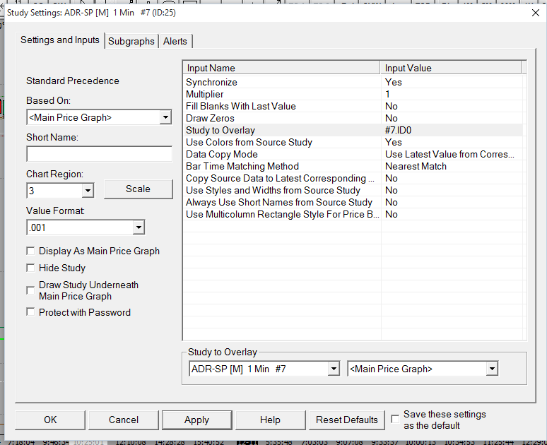 Overlay (Single Line) study is being used to reference this ADR chart by 2 other charts. Yes those two charts have extended hours session times ie 18:00 to 17:15. Is there a way I can achieve what I want ie for the ADR chart to only plot the Cash hours and this is then over-layed on a full session chart(s)? |