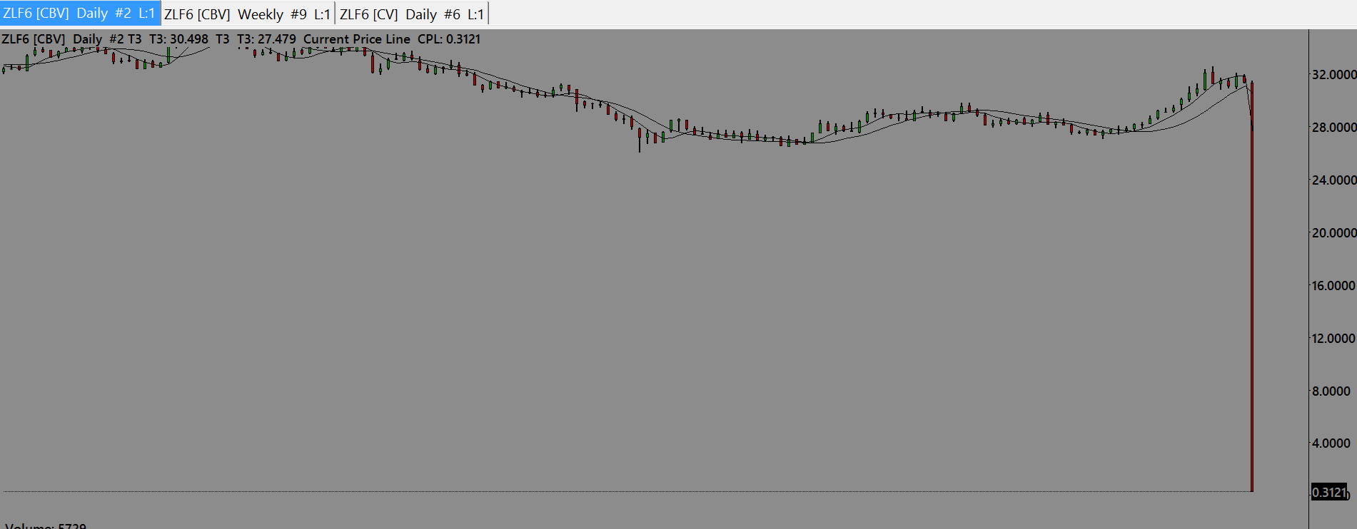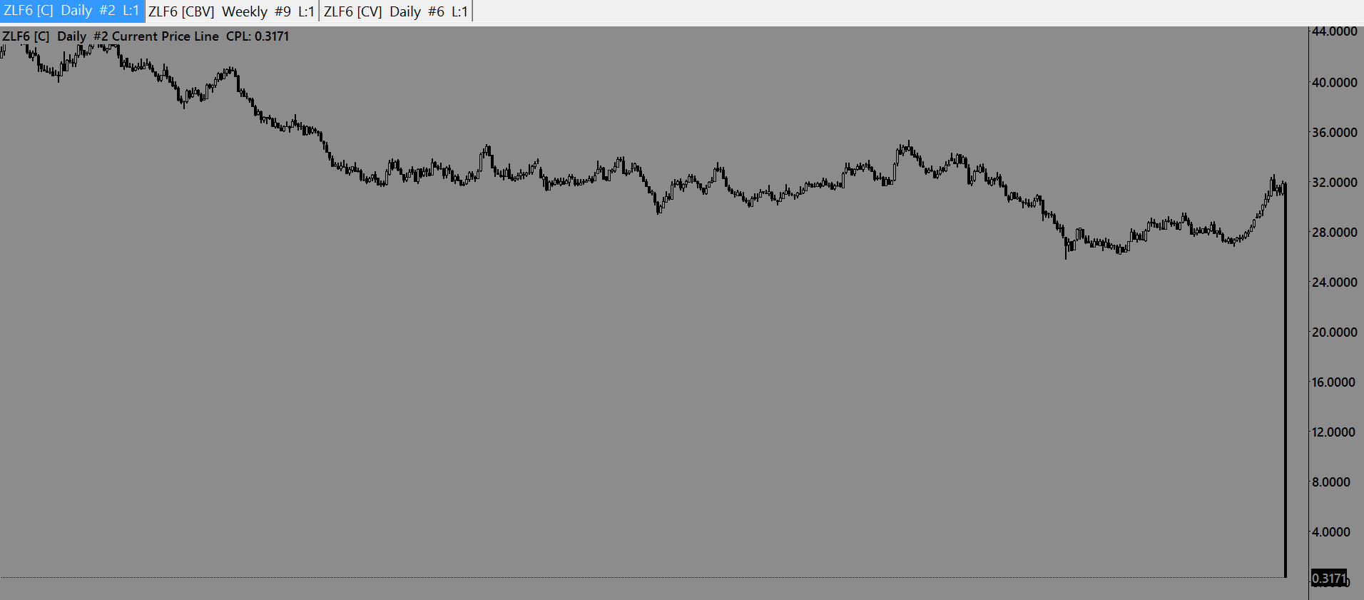 Hello support. Please take a look at this zlf6 daily chart. Something is not right with it. 60 Min chart [CV] is fine. How can i correct it?