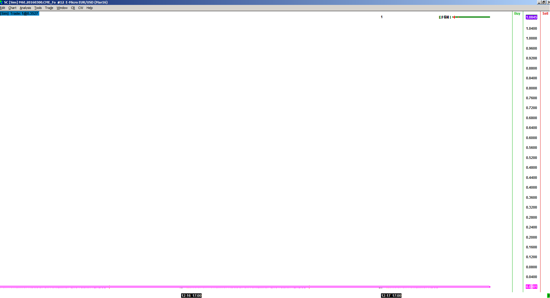 Current Quote M6E.20160300.CME_Fo: 2015-12-18 15:59:58.000 Fri: LastPrice:1.0897 LastSize:1 Daily Price Chg:0.0067 Ask:1.0900 Bid:1.0877 Bid Ask Avg:1.0888 Bid Ask Diff:0.0 Ticks Bid x Ask:1 x 2 Daily Open:1.0847 Daily High:1.0900 Daily Low:1.0830 Prev Close:1.0830 Daily Volume:16859 Num Trades:3445 ******************************************* Chart Values for Last Displayed Column: 2015-12-17 17:00:00.000 Bar Begin Time: Region 1: M6E.20160300.CME_Fo 1 Day #16 () : Price Chg:1.0896 Open:0.0001 High:1.0897 Low:0.0001 Last:1.0897 Volume:16831 # of Trades:7309 OHLC Avg:0.5449 HLC Avg:0.7265 HL Avg:0.5449 Bid Vol:9308 Ask Vol:7523 Current Price Line (500, Last, Yes, No, No) : CPL:1.08969998 Date Time Of Last Edit: 2015-12-19 00:58:36