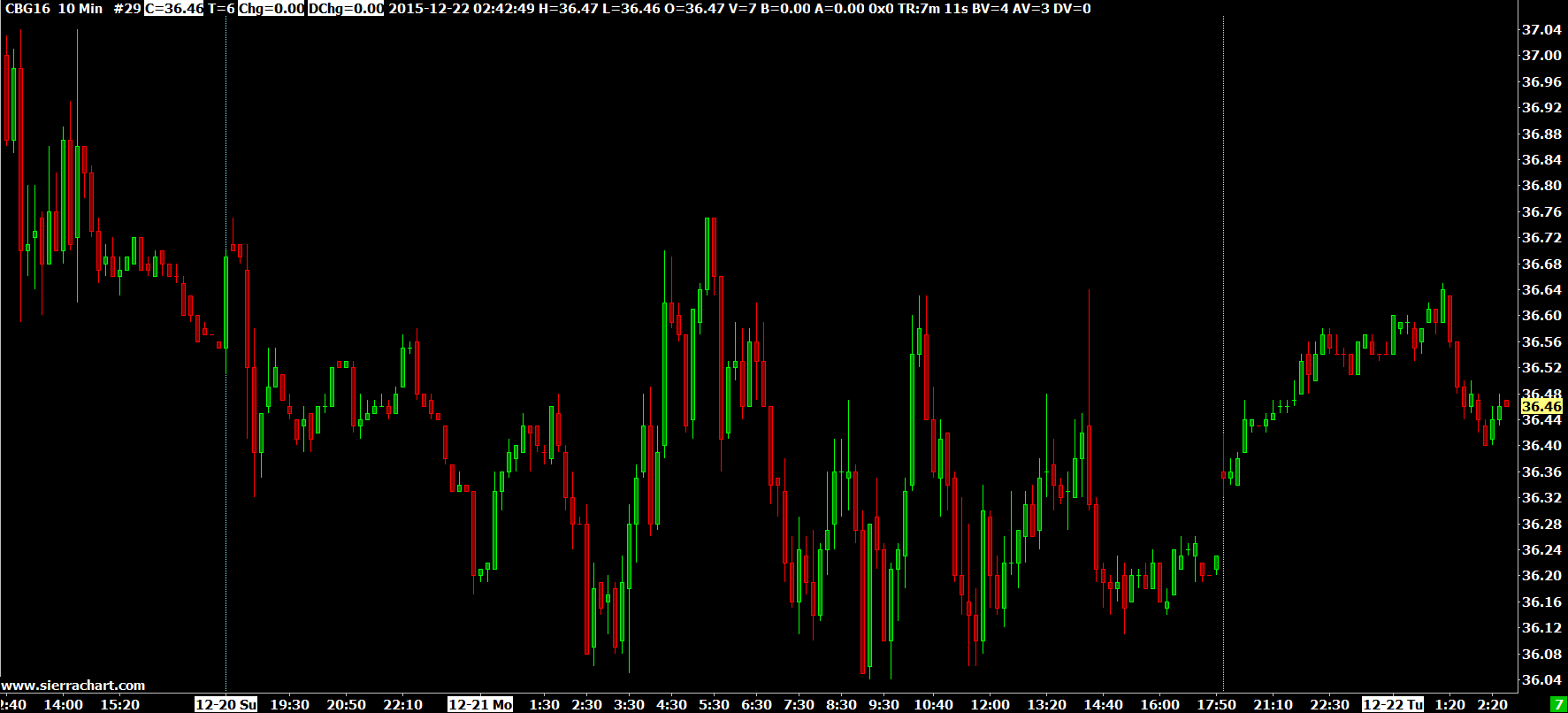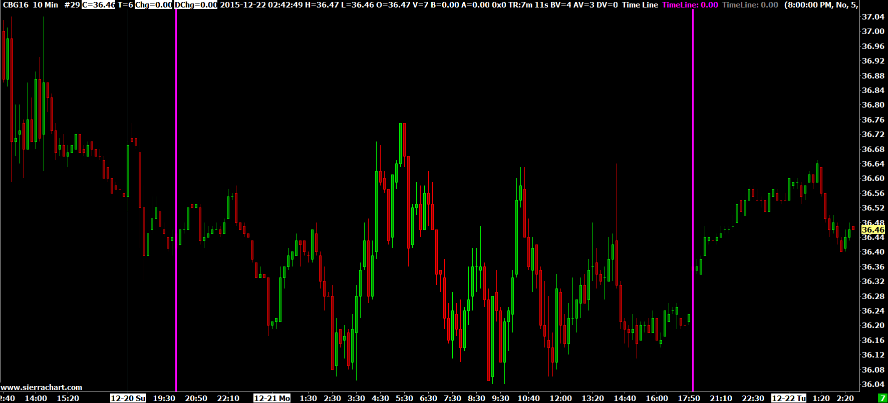 | SC's suggestion in post 2 is surely wrong as will still misses the 6pm start on Sunday. Not sure what is meant by this. As long as the Load Weekend Data/Load Sunday Data option is selected, the 18:00 Sunday open will be included in the chart. That is considered part of Sundays trading. Monday begins at 20:00 Sierra Chart Support - Engineering Level Your definitive source for support. Other responses are from users. Try to keep your questions brief and to the point. Be aware of support policy: https://www.sierrachart.com/index.php?l=PostingInformation.php#GeneralInformation For the most reliable, advanced, and zero cost futures order routing, *change* to the Teton service: Sierra Chart Teton Futures Order Routing Date Time Of Last Edit: 2015-12-22 07:57:08  |