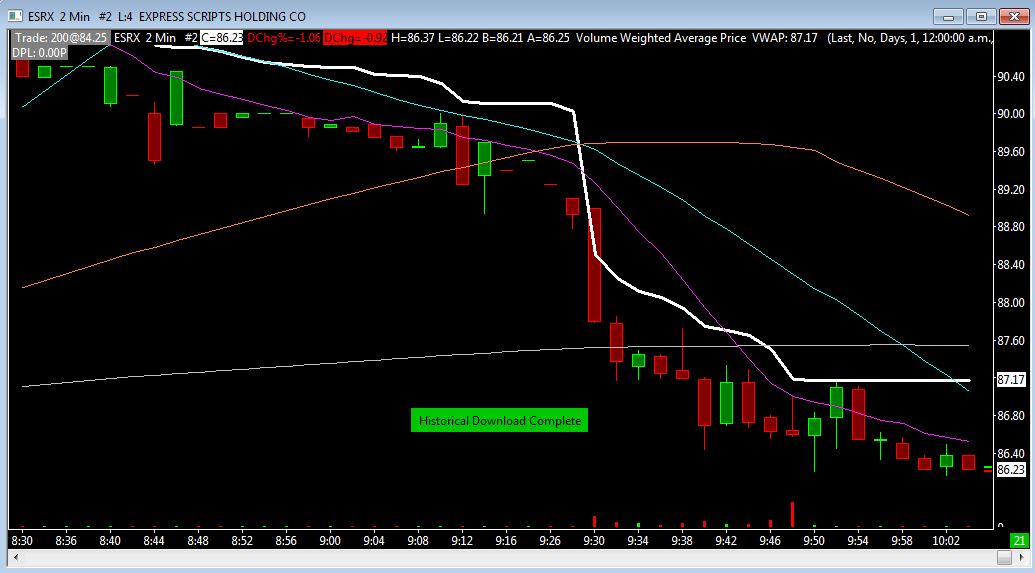 I just used the Chart>>Recalculate (reload and recalculate) with ESRX, it didn't fix the VWAP. When I deleted+downloaded data, it got fixed. ESRX 2 Min #2 | Reloading chart. | 2015-12-22 13:13:07 Intraday data recording state for symbol ESRX is set to download 'Pending'. | 2015-12-22 13:13:11 Reloading all charts with filename: ESRX.scid | 2015-12-22 13:13:11 HD Request # 291 | Downloading Intraday chart data for ESRX to the file ESRX.scid. Service: equities.us | 2015-12-22 13:13:11 HD Request # 291 | Download start Date-Time: 2015-06-19 14:13:11.000 | 2015-12-22 13:13:11 HD Request # 291 | Using server: scdf1.sierracharts.com port 10149 | 2015-12-22 13:13:11 Socket (0) | Resolved address ds6.sierracharts.com to IP 8.18.161.131 | 2015-12-22 13:13:11 Socket (277) | Connected. | 2015-12-22 13:13:11 HD Request # 291 | Sending historical data logon request message. | 2015-12-22 13:13:11 ESRX 15 Sec #1 | Reloading chart. | 2015-12-22 13:13:11 ESRX 15 Sec #1 | Currently no data in file to display. Will start historical data download and real-time updates. File: C:\SierraChart\Data\ESRX.scid | 2015-12-22 13:13:11 ESRX 5 Min #3 | Reloading chart. | 2015-12-22 13:13:11 ESRX 5 Min #3 | Currently no data in file to display. Will start historical data download and real-time updates. File: C:\SierraChart\Data\ESRX.scid | 2015-12-22 13:13:11 HD Request # 291 | Requesting Intraday data. Start Date-Time: 2015-06-19 14:13:11. Record interval: 1. Symbol: ESRX | 2015-12-22 13:13:11 ESRX 2 Min #2 | Reloading chart. | 2015-12-22 13:13:11 ESRX 2 Min #2 | Currently no data in file to display. Will start historical data download and real-time updates. File: C:\SierraChart\Data\ESRX.scid | 2015-12-22 13:13:11 HD Request # 291 | Decompressing data. | 2015-12-22 13:13:11 HD Request # 291 | Receiving Intraday data for ESRX starting at 2015-06-19 14:14:00 | 2015-12-22 13:13:11 HD Request # 291 | Timestamp of first Intraday data file record written: 2015-06-19 14:14:00 | 2015-12-22 13:13:11 Socket (277) | Shutdown and closed. | 2015-12-22 13:13:19 The network socket for historical data has been closed. | 2015-12-22 13:13:19 HD Request # 291 | Received 468852 records from 2015-06-19 14:14:00 to 2015-12-22 12:58:11 (186.0 days) and wrote 468852 records for ESRX | 2015-12-22 13:13:19 HD Request # 291 | Intraday download COMPLETE for ESRX. Completion time: 8s. Unique request ID: 306 | 2015-12-22 13:13:19 Removed historical data download ID 306 | 2015-12-22 13:13:19 Real-time Intraday chart data file updates started for ESRX | 2015-12-22 13:13:19 Intraday data recording state for symbol ESRX is set to download 'Pending'. | 2015-12-22 13:13:19 HD Request # 292 | Downloading Intraday chart data for ESRX to the file ESRX.scid. Service: ib | 2015-12-22 13:13:19 HD Request # 292 | Download start Date-Time: 2015-12-22 12:58:11.000 | 2015-12-22 13:13:19 HD Request # 292 | Requesting a total of 0 days and 5708 seconds. | 2015-12-22 13:13:19 HD Request # 292 | IB Backfill - Seconds requested: 5708. Seconds Remaining: 0. | 2015-12-22 13:13:19 HD Request # 292 | Requesting 5708 Seconds of data at 30 secs with ending Date-Time at 2015-12-22 14:23:19 for ESRX | 2015-12-22 13:13:19 HD Request # 292 | Processing historical data message from TWS | 2015-12-22 13:13:19 HD Request # 292 | Receiving Intraday data for ESRX starting at 2015-12-22 12:48:30 | 2015-12-22 13:13:19 HD Request # 292 | Timestamp of first Intraday data file record written: 2015-12-22 12:58:30 | 2015-12-22 13:13:19 HD Request # 292 | Received 51 records and wrote 30 records from 2015-12-22 12:48:00 to 2015-12-22 13:13:00. | 2015-12-22 13:13:19 HD Request # 292 | Received 51 records from 2015-12-22 12:48:30 to 2015-12-22 13:13:00 (24.5 minutes) and wrote 30 records for ESRX | 2015-12-22 13:13:19 HD Request # 292 | Intraday download COMPLETE for ESRX. Completion time: 0s. Unique request ID: 307 | 2015-12-22 13:13:19 Removed historical data download ID 307 | 2015-12-22 13:13:19 Real-time Intraday chart data file updates started for ESRX | 2015-12-22 13:13:19 |