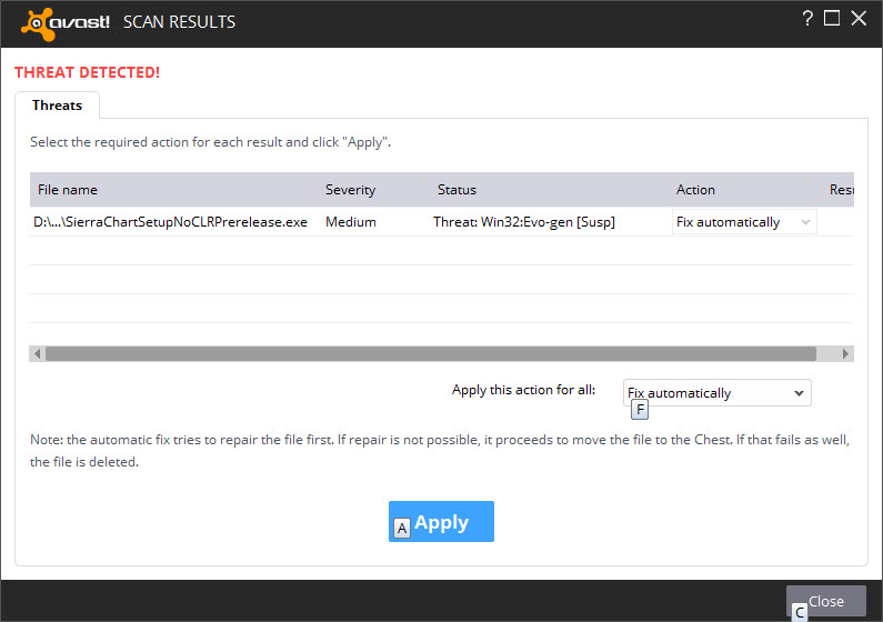 Pre-release version 1343 is being flagged by Avast as containing a virus (see attached image) and is preventing me from installing it. I am forced to update because Sierrachart is not running on 1297 anymore. I wanted to try version 1343 hoping that IB volume was fixed. I previously updated to 1336 from 1297 but went back to 1297 since IB volume still has a problem. Volume was always lower on the charts of stocks I trade and I have to keep refreshing for volume to be corrected. I could not trust the volume shown on the chart so it affects my trading. The time and sales window showed a lot of single digit volume trades going on along with trades with volume of 100 or more. Obviously, there was something wrong because when I went back to version 1297, I do not see any single digit volume trades on the time and sales window. You said that the IB volume problem was supposed to have been fixed in 1336 but it was not. I didn't want to update since I don't use the new features added to Sierrachart, but I'm forced to because Sierrachart would not run anymore. Date Time Of Last Edit: 2015-12-24 04:47:55