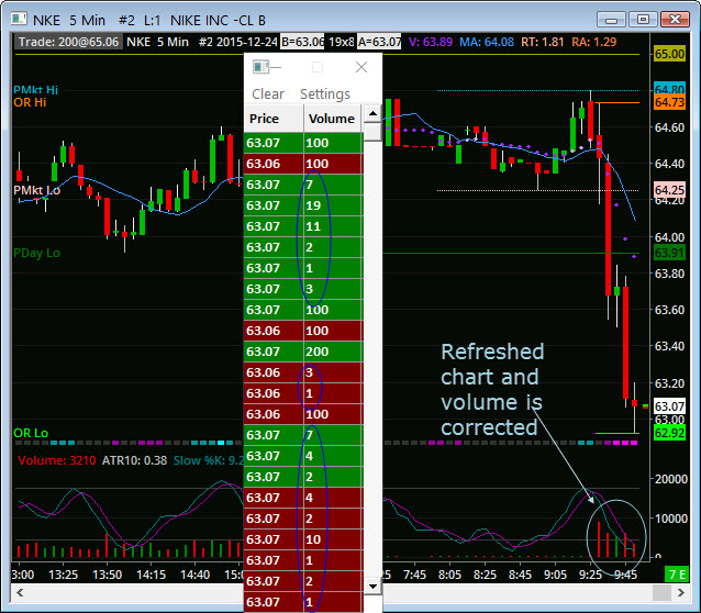If I refresh chart, the volume is corrected. I cannot keep on refreshing chart while I'm trading. It's a big distraction. Notice the volume on the time and sales shows a lot of less than 10 shares trade. I think this is messing up the volume. Please fix this and in the meantime, please let me go back and use version 1297. |