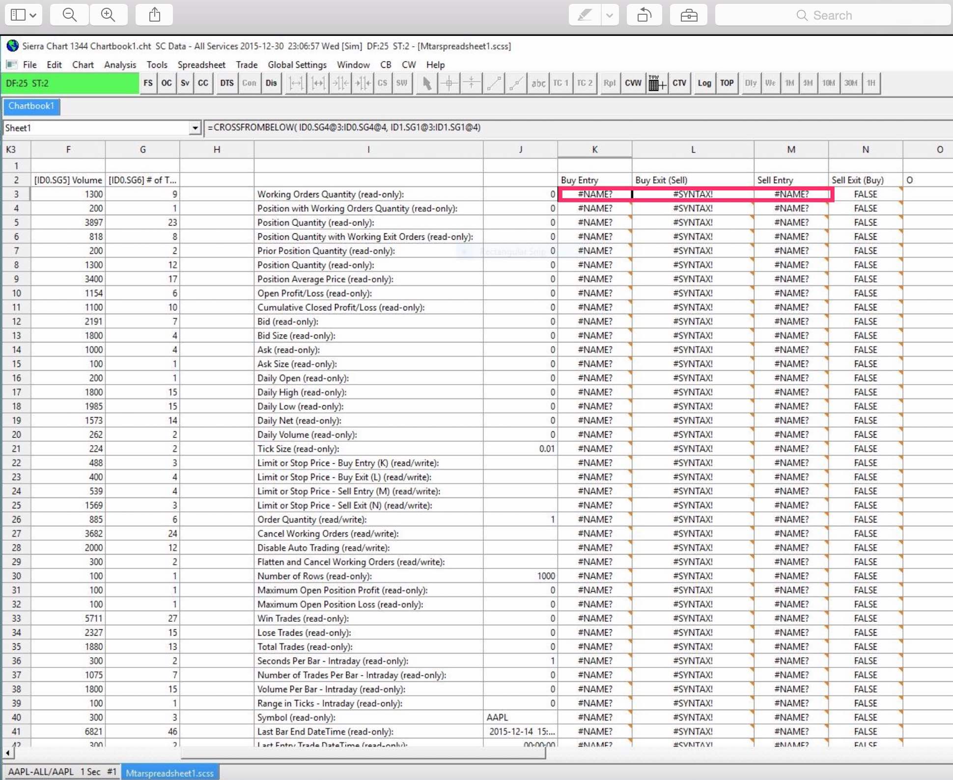 Cool. Adding that new formula to K3 made both K3 and M3 say "FALSE" and got buy and sell arrows to show up on the chart. However, L3 still says "#SYNTAX!" and my "Trade Activity Log" shows no trades happened when I ran the backtest. Here is the formula I've been using in L3 =OR( AND( $J$8 > 0, ID0.SG4@$3 < =$J$9-1), AND( $J$8 > 0, ID0.SG4@$3 >= $J$9+2)) Date Time Of Last Edit: 2015-12-31 06:05:40