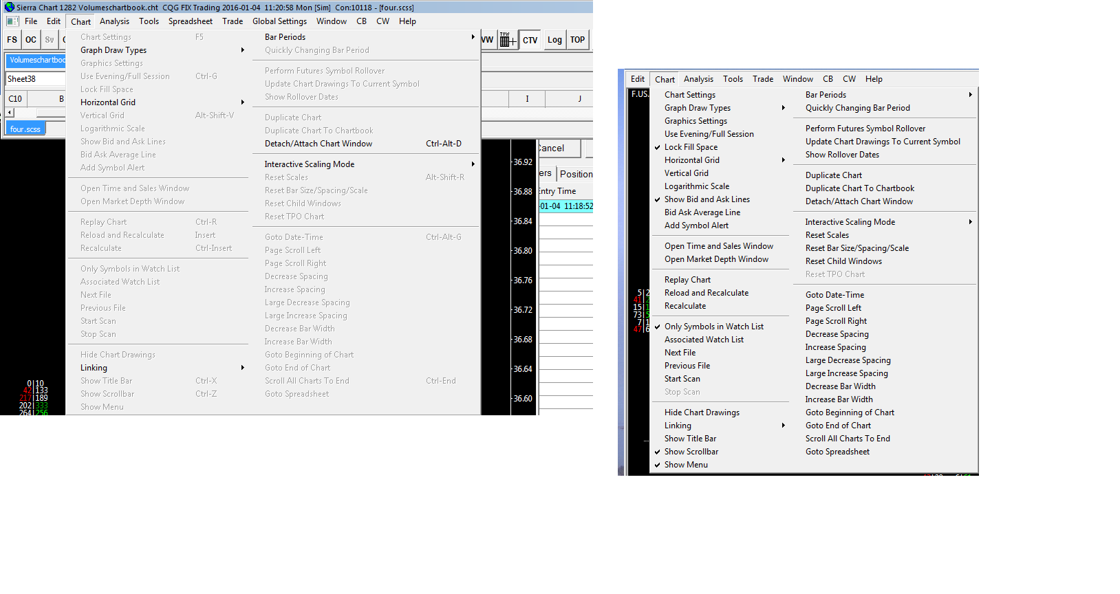What we see does make sense. On the menu for the main Sierra Chart window, there needs to be an active chart window for the Chart commands to be displayed. What we see is a Spreadsheet window active instead. Sierra Chart Support - Engineering Level Your definitive source for support. Other responses are from users. Try to keep your questions brief and to the point. Be aware of support policy: https://www.sierrachart.com/index.php?l=PostingInformation.php#GeneralInformation For the most reliable, advanced, and zero cost futures order routing, *change* to the Teton service: Sierra Chart Teton Futures Order Routing Date Time Of Last Edit: 2016-01-04 18:46:37