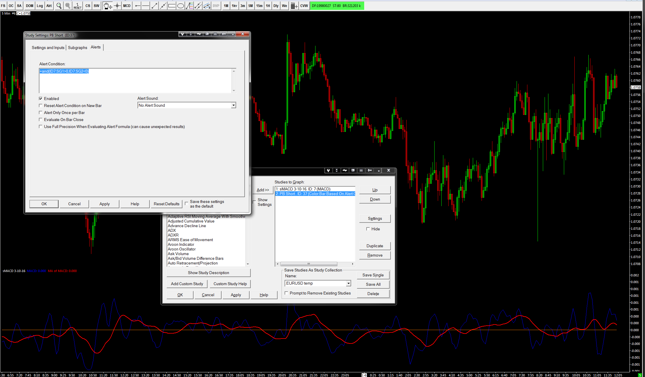 On IB Forex symbols (e.g. EURUSD, GBPUSD) alerts are not triggering. Example, the attached chart shows EURUSD with a simple MACD (ID7), and an alert for whenever the red line is below zero and the blue line is above zero. Those conditions are met on multiple occasions. Nonetheless, no signals come up. If I change the instrument to a CME symbol, signals trigger normally. Happy to share the chartbook. Please help. Thanks. |