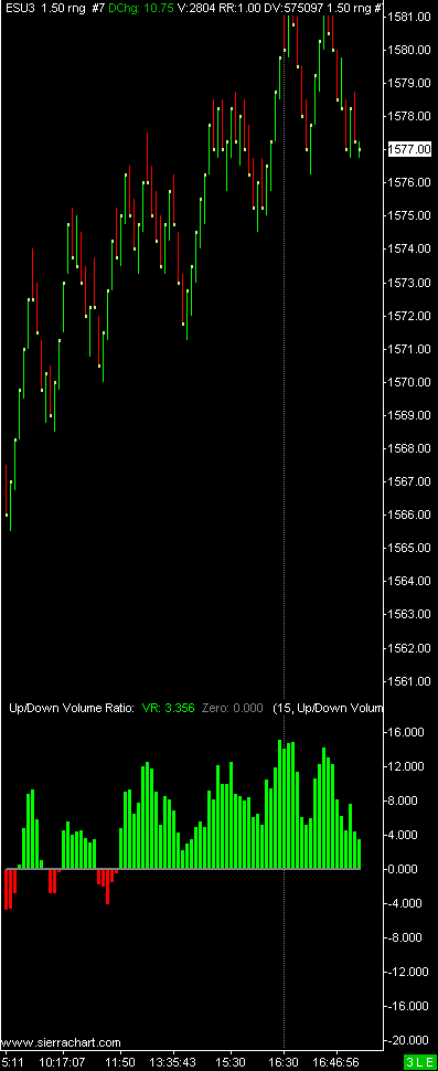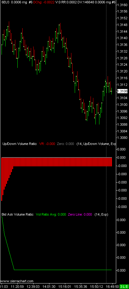 Hi SC, I get defective data in 6EU3 range chart, Up/Down Volume ratio study. My data feed is OEC. ESU3 range chart shows good data by the same study when applied. I'm on ver 991. I didn't have this problem in the past, about 2 month ago.. Examples attached. 6EU3 example of Up/Down Volume ratio study with defective data: http://www.sierrachart.com/image.php?l=1372167929348.png ESU3 example of good Up/Down Volume ratio study data http://www.sierrachart.com/image.php?l=1372168369919.png Thx, Avi |