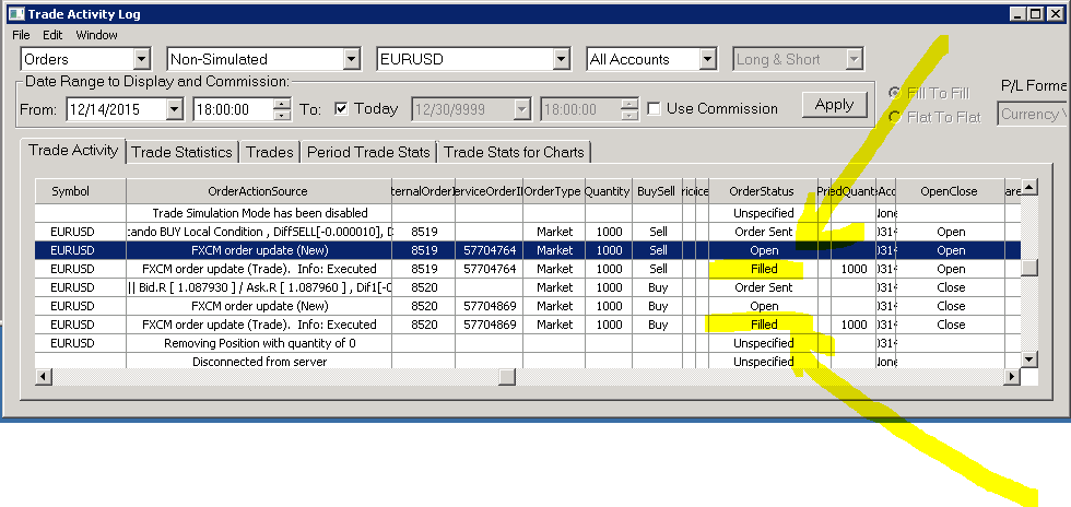Hello, I tried to use this code but dont work: http://www.sierrachart.com/index.php?page=doc/doc_ACSILTrading.html#s_SCTradeOrder ( The price returned its 0.00000 ) Tested on real orders. I am using FXCM and Currenex How can I read the "filled" value on Trading Activity Log? Its seem like acsil code dont work with trade order status, I can not make to work. If I dont have a reliable way to read the "filled" field then my pair trading system can not work and then I will to leave Sierra Chart proyect. I am sure its possible because you already show on TradeActivityLog the track of orders ( very usefull ) Please check the image for clarify, also provide me an example of how to read this, I think this its the last test that I will performance before continue or leave the proyect. Thanks |