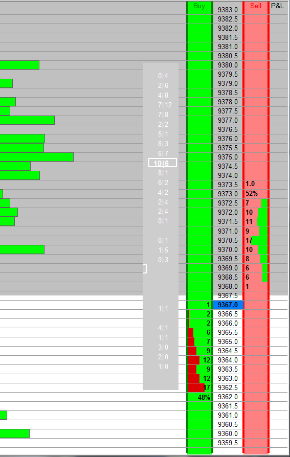 Hi, You can add the volume by price study to the DOM, and there is a setting to 'Display Volume in Bars', selecting 'Bid Volme x Ask Volume' might give you what you are after |