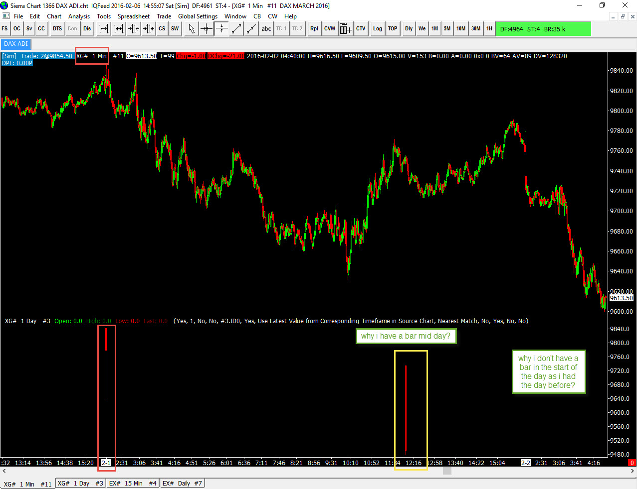 that's what i would expect. yet, here is my study again, which shows mid day bars as for the study overlay hers is the daily chart http://www.sierrachart.com/image.php?l=1455084542690.png here is the 1 min chart with overlays http://www.sierrachart.com/image.php?l=1455084595656.png where you can see there are bars in the middle of the day and if i use daily bars as the source this should not happen thanks |