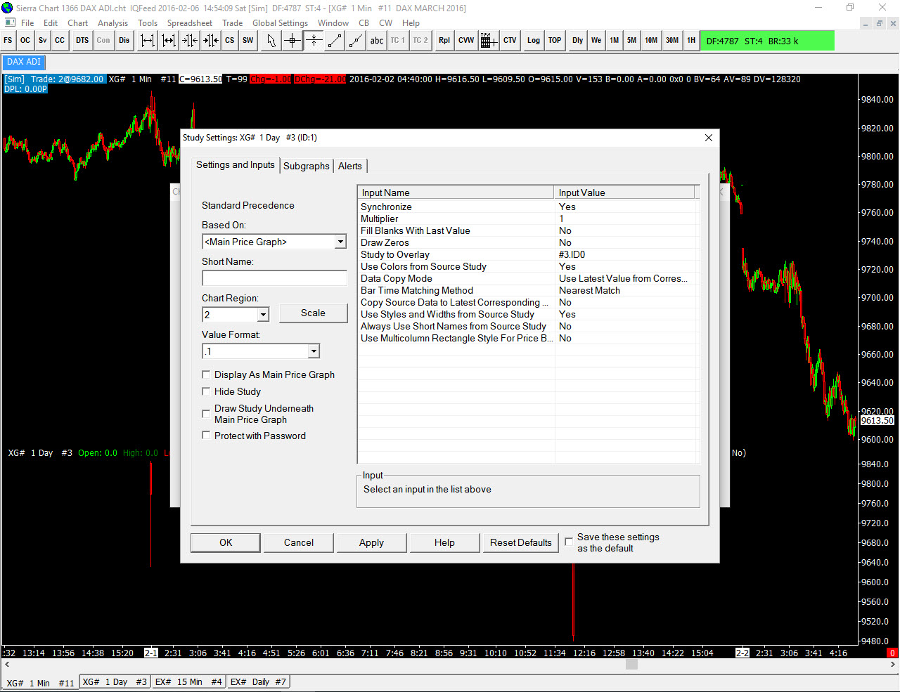 Here is a chart image showing overlaying Daily bars on an Intraday chart: http://www.sierrachart.com/image.php?l=1455009822290.png It shows all of the Input settings being used. Sierra Chart Support - Engineering Level Your definitive source for support. Other responses are from users. Try to keep your questions brief and to the point. Be aware of support policy: https://www.sierrachart.com/index.php?l=PostingInformation.php#GeneralInformation For the most reliable, advanced, and zero cost futures order routing, *change* to the Teton service: Sierra Chart Teton Futures Order Routing |