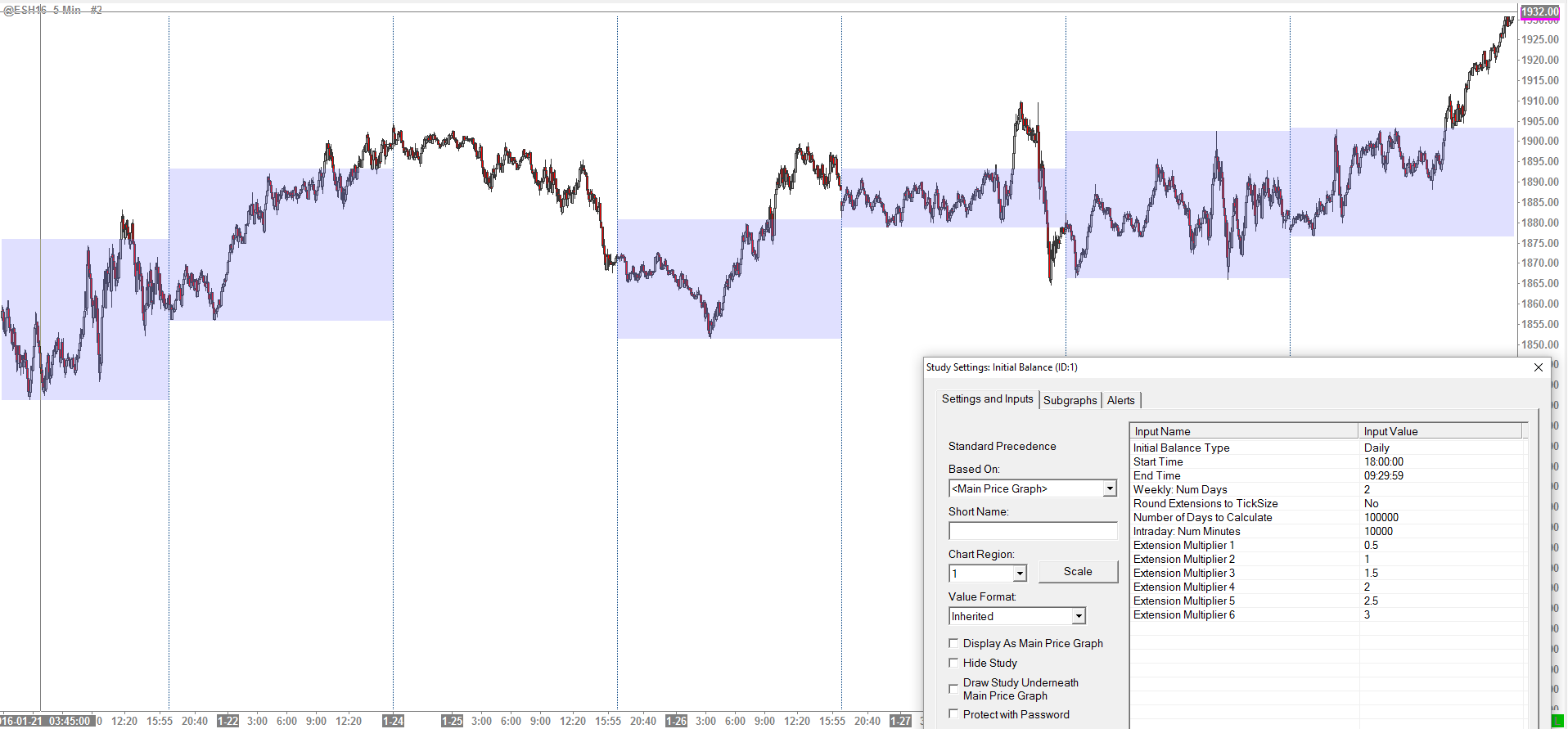 SC Support, Attached please find a Chartbook as requested. I use the Initial Balance to track the High and Low price for the overnight trading session in ES that begins at 6pm EST and goes until 9:30am EST. The study works great on Tue, Wed, Thu, and Fri. However, it doesn't draw these lines for the first session of the week that begins at 6pm EST on Sunday, and this is also true on a historical basis if you scroll back through the chart. If I set the start time to 18:00:01 instead of 18:00:00, the study works as expected on Sunday nights. However, it won't include the entire session because it marks highs and lows from the next 5m bar that begins at 18:05 rather than at the true session start at 18:00. Perhaps, there is a setting I'm not aware or a certain logic to the time stamp that I need to better understand. Many thanks in advance for your help with this issue. |