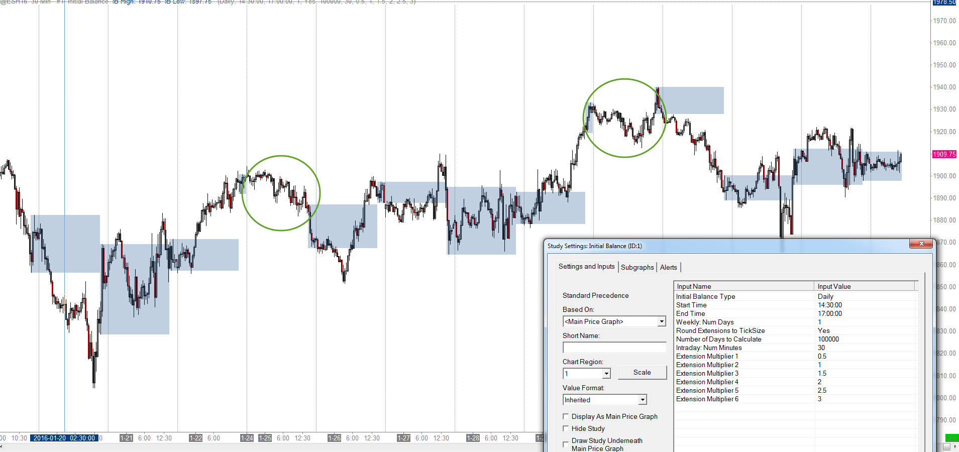 SC Support, I have applied the Initial Balance study to a 5min candlestick chart using the following settings to capture the overnight range and corresponding IB extensions for ES. Initial Balance Type: Daily Start Time: 18:00:00 End Time: 09:29:59 Number of Days to Calculate: 10 The indicator works great on Tue, Wed, Thr, Fri both in real-time on those weekdays and historically when scrolling back through those days. However, it doesn't produce any lines on my chart on Mondays. If I change the start time to 18:00:01, it works on Mondays but begins marking the overnight high / low from the 5m bar with timestamp 18:05 from Sunday evening. Am I missing something in terms of understanding bar timestamps or the indicator? I naturally believe that it should work the same on Mondays as other weekdays given that there is a bar with timestamp 18:00:00 available on Sunday evening. Many thanks in advance for your help. |