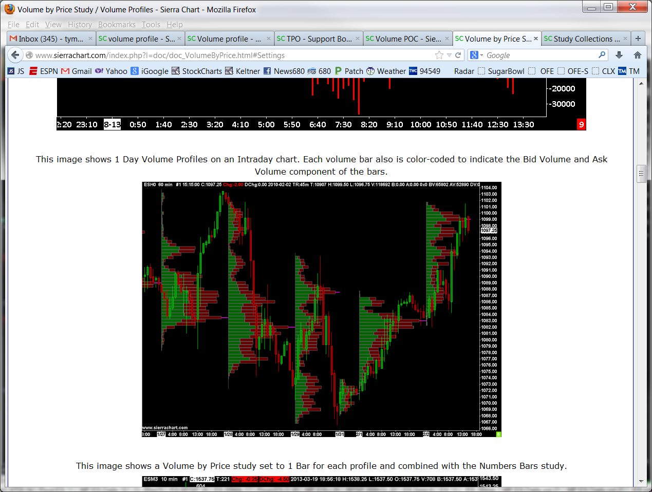 I have been able to get a volume profile for es using the "volume by price" study. My remaining issue: how do i get multiple days? If I change the settings to more than 1 day, this 1 entire profile includes those number of days. I would like a volume profile for each day. Did I miss it in the settings? Please see attached of what I did, and what I would like for multiple days. Thanks to all for helping me!Especially Ganz! Tom |