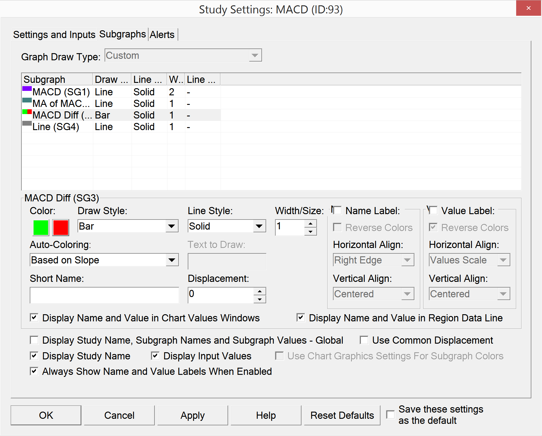 Use the Color Bar Based On Alert Condition study. You'll need a separate instance for each color. You'll need 3 instances, one for higher, lower, and equal. They need to be below the MACD study in the Studies to Graph list. -Set the Based On to the MACD study -Set the Chart Region to the same as the MACD study -Set the Output When Condition True to Use Input Data -Set the Input Data to MACD Diff -Set the Draw Style to Bar -Set the colors of each -Use these formulas: =C>C[-1] =C<C[-1] =C=C[-1] |