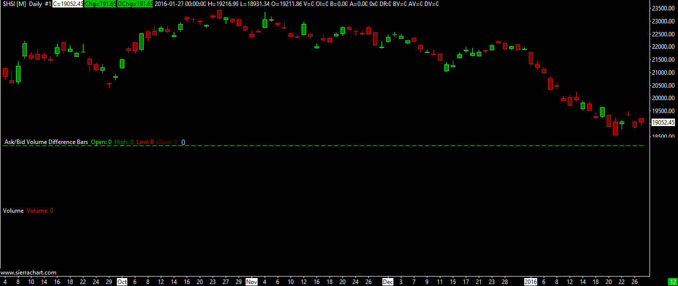 Currently I am using the trial version of Sierra Chart and are encountering the following issues : 1) Whenever I tried to open the historical chart for $HSI of a lower time frame ( Eg hourly ; minute ), the chart window stays blank after the command for loading is complete. http://www.sierrachart.com/image.php?l=1453907691797.png 2) When I add the Volume and Ask/Bid Volume Difference Bars studies to the historical $HSI daily chart, nothing are reflected for both the studies added. http://www.sierrachart.com/image.php?l=1453907740566.png Both the screenshots are uploaded for your reference and understanding of the issues I am facing while using Sierra Chart. Need your kind assistance and advise. Thank you. Sincerely, Darren |