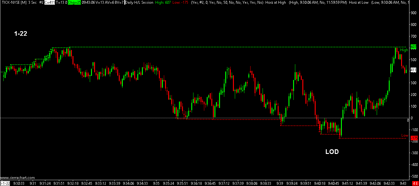 I have a TICK-NYSE chart that has the "Daily OHLC" study. The Hi or Low of the day line will not draw until it is above/below zero accordingly. Eg: In the attached pic, the New low of the day doesn't start drawing until the tick is below zero. http://www.sierrachart.com/image.php?l=1454285689484.png |