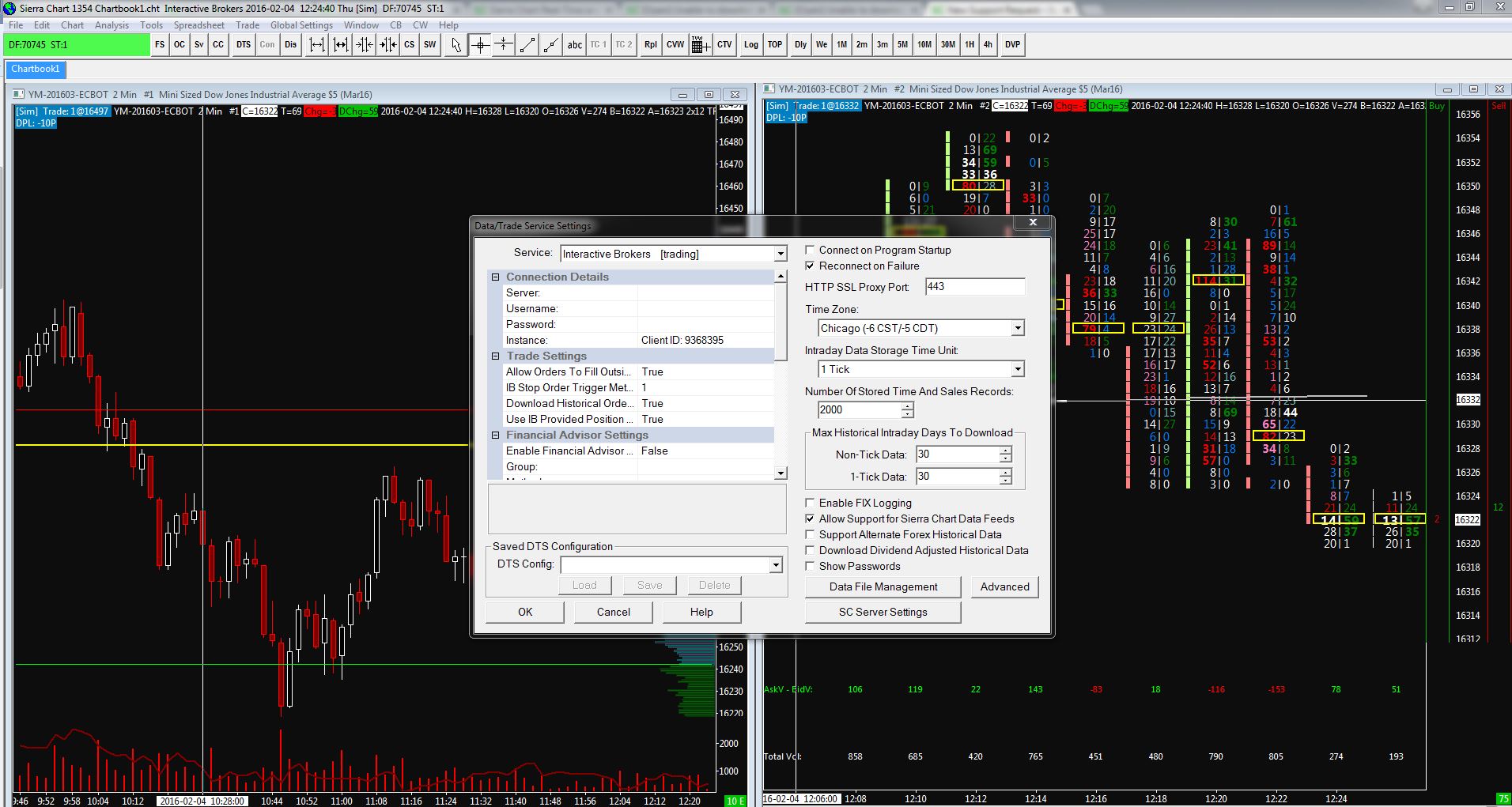 Hello, I have a problem to get to my charts data from SC data feed. Everything should be activated and subscribed but if I set IB for trading,I get some data, but those data are from IB, not from Sierra. I cannot see [M] indicator as described and also chart DOM has just the nearest one bid and ask volume - data from IB. I cant get to point, I would have Dow Jones Industries futures YM-201603-ECBOT from Sierra data feed. Could you please describe step by step how to get it? I need to be sure I have tick data, not compressed from IB, because I trade volume bars. Thank you in advance for help. |