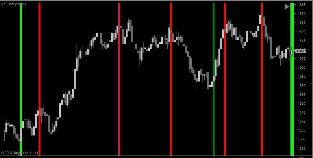 =OR(AND(L<=L[-1],L<=L[-2],C>=C[-1],C>=C[-1],C>=O,(C-O)<(H-L),V[-1]>V[-2],V[-1]>V[-3],V[-1]>V[-4],V[-1]>V[-5],V[-1]>V[-6]),AND(L>=L[-1],L<=L[-2],C>=C[-1],C>=O,(C-O)<(H-L),V[-1]>V[-2],V[-1]>V[-3],V[-1]>V[-4],V[-1]>V[-5],V[-1]>V[-6])) this is your "high volume spike long signal" condition 1 & 2. i dont know what "If bartype < 2 then iVolume = Ticks else IVolume = volume;" is supposed to mean. follow that frame work for your short signals code and use 2 "color background based on alert condition" studies and put long signal formula in one and short signal formula in another |