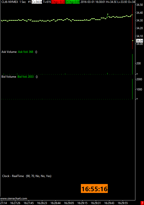 Hi, Trade of CLJ6 03-01-2016 at 16:30:14.08 PM. During the trade I made a Video. On Intraday chart after trade which I use (Historical Download was completed) I watch Chg.=-0.32 in red from 34.36 to 34.04. On Video of the same chart which I made in the time of trade I watch Chg.=+0.11 in green from 34.36 to 34.47. The difference between Chg.=-0.32 and Chg.=+0.11 is gigantic, when I creating a methodology of a trades. The chart which I watch on Video is true and chart which I watch after trade is not true. Please help me to find a chart which will show me true picture of a trade. Sincerely |