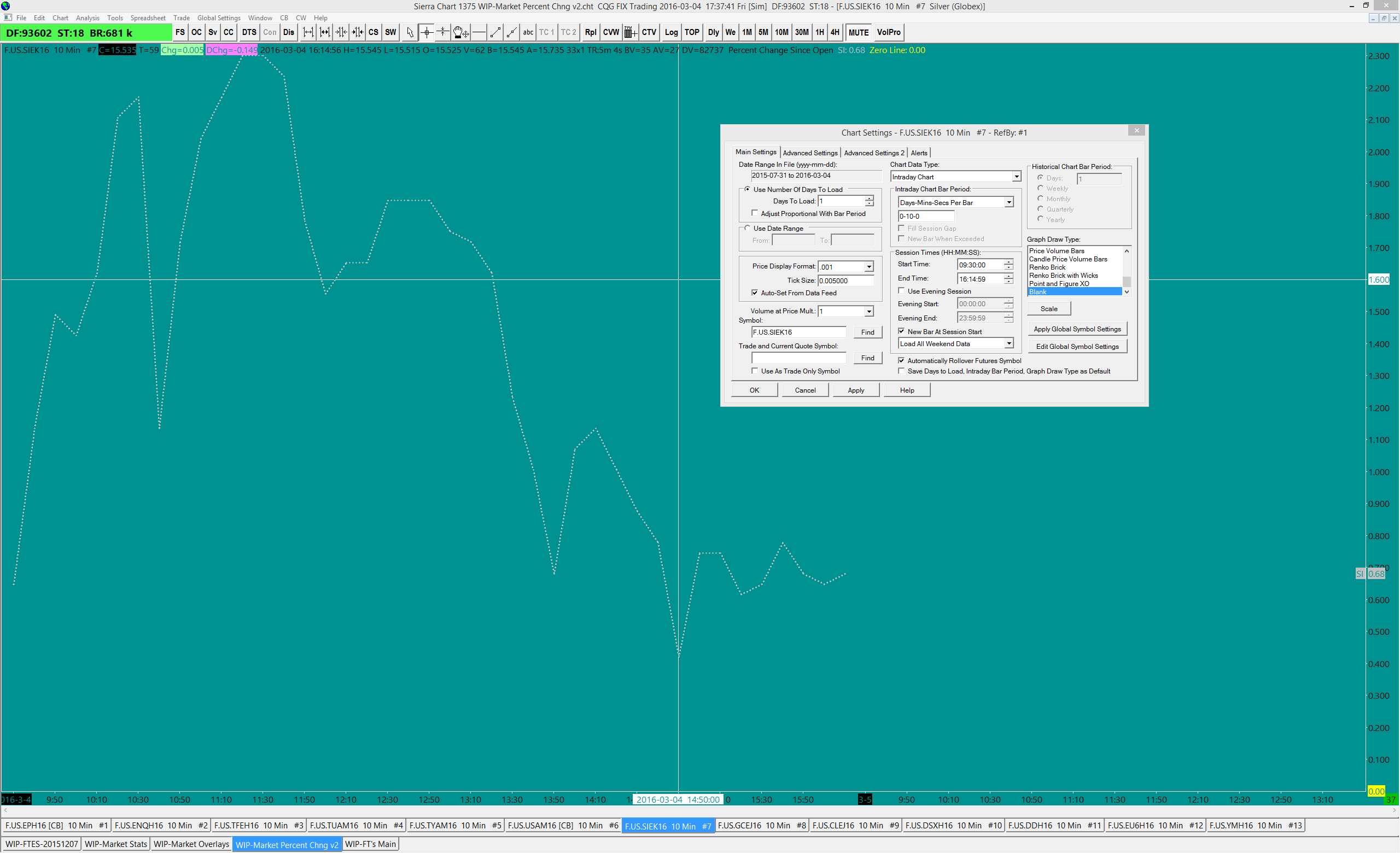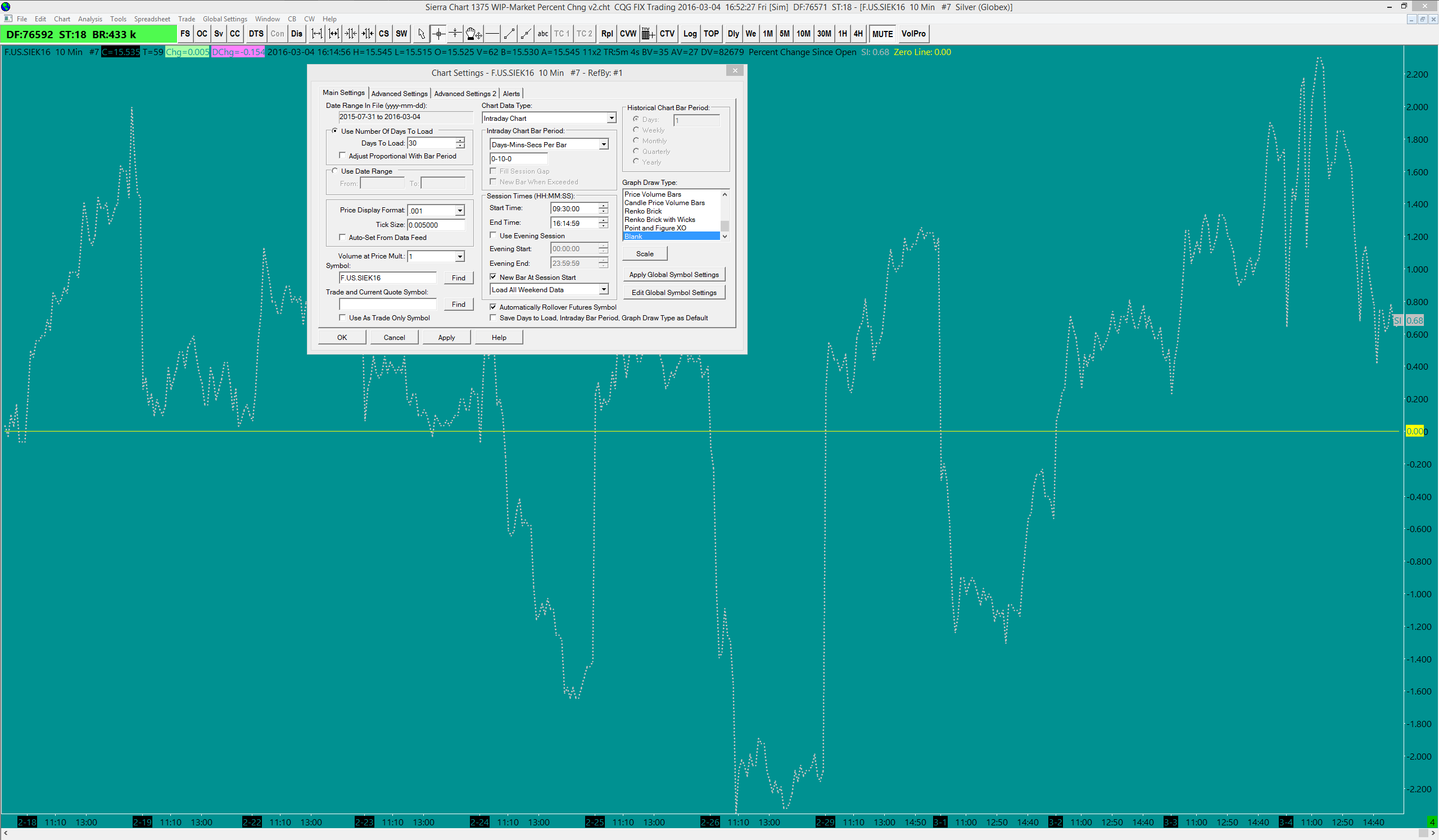 As per the attached chart, I'm finding that the Percent Change Since Open study does not always start at zero on the open. I've attached a chart of F.US.SIEK16 showing: 1. That the study correctly had price starting from zero (9:30 EST) on Feb 24, 25, 26, 29 and March 1 and 2. 2. That price did not start from zero on Feb 19, 22, 23, March 3 and March 4. I have other charts where I have the same inconsistency, i.e. Gold and the NQ. I'm using v1375 with CQG data. Any ideas why this is happening and if there is anything I can do to fix it? Thank you, Richard |