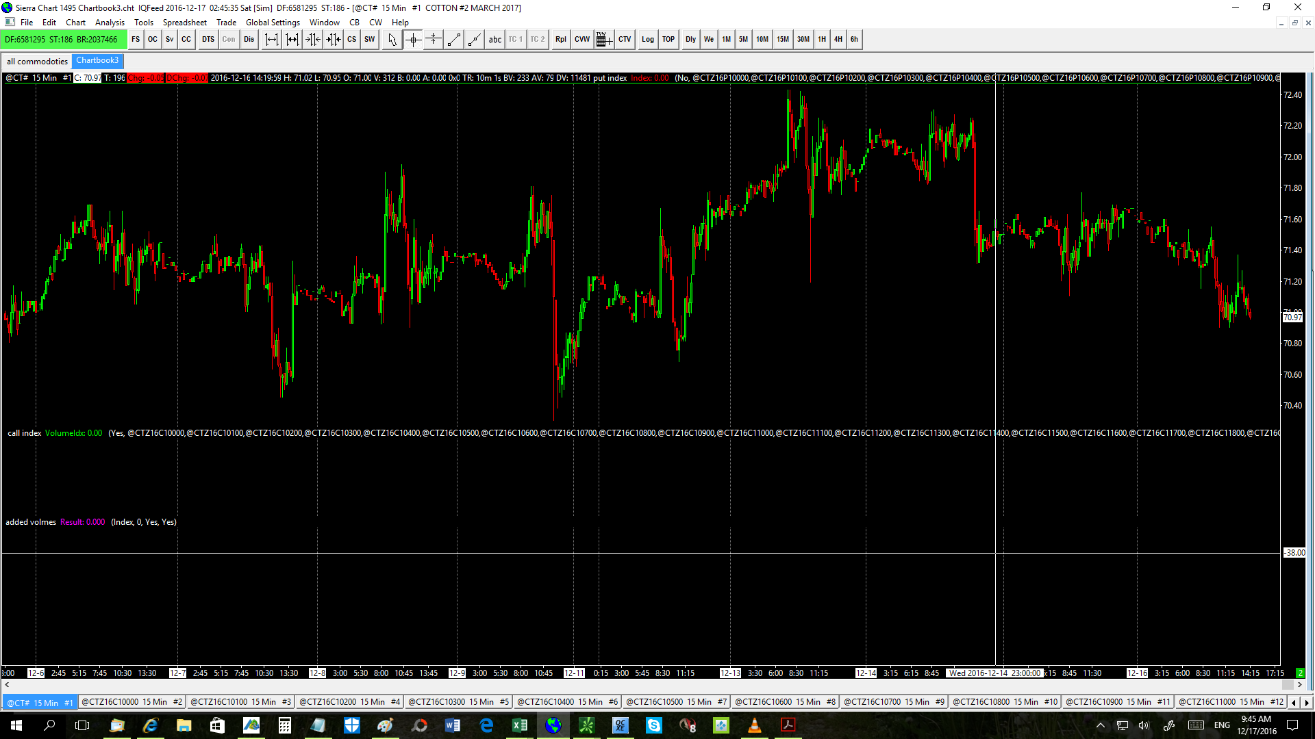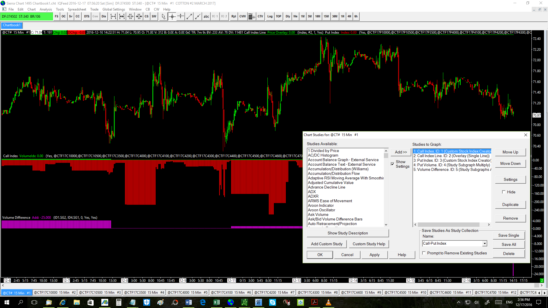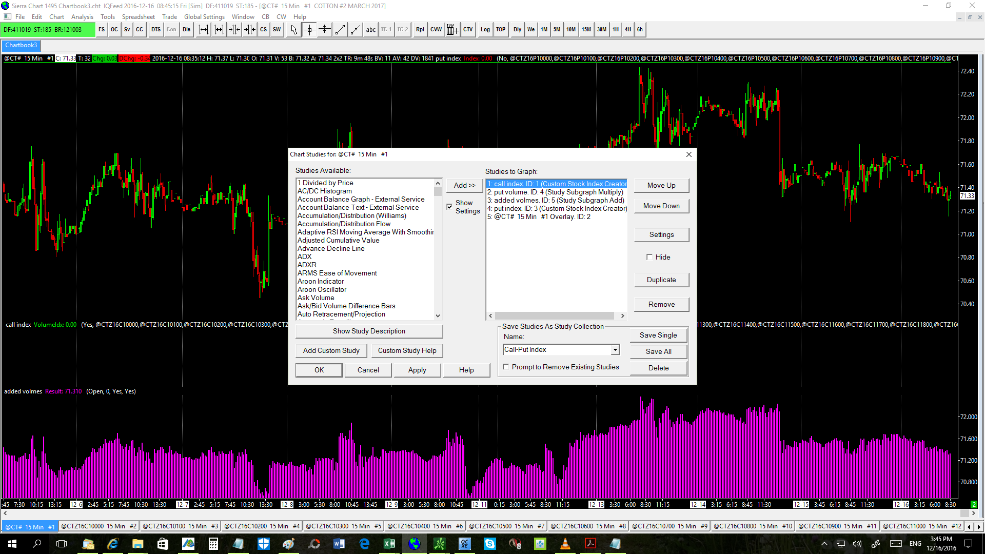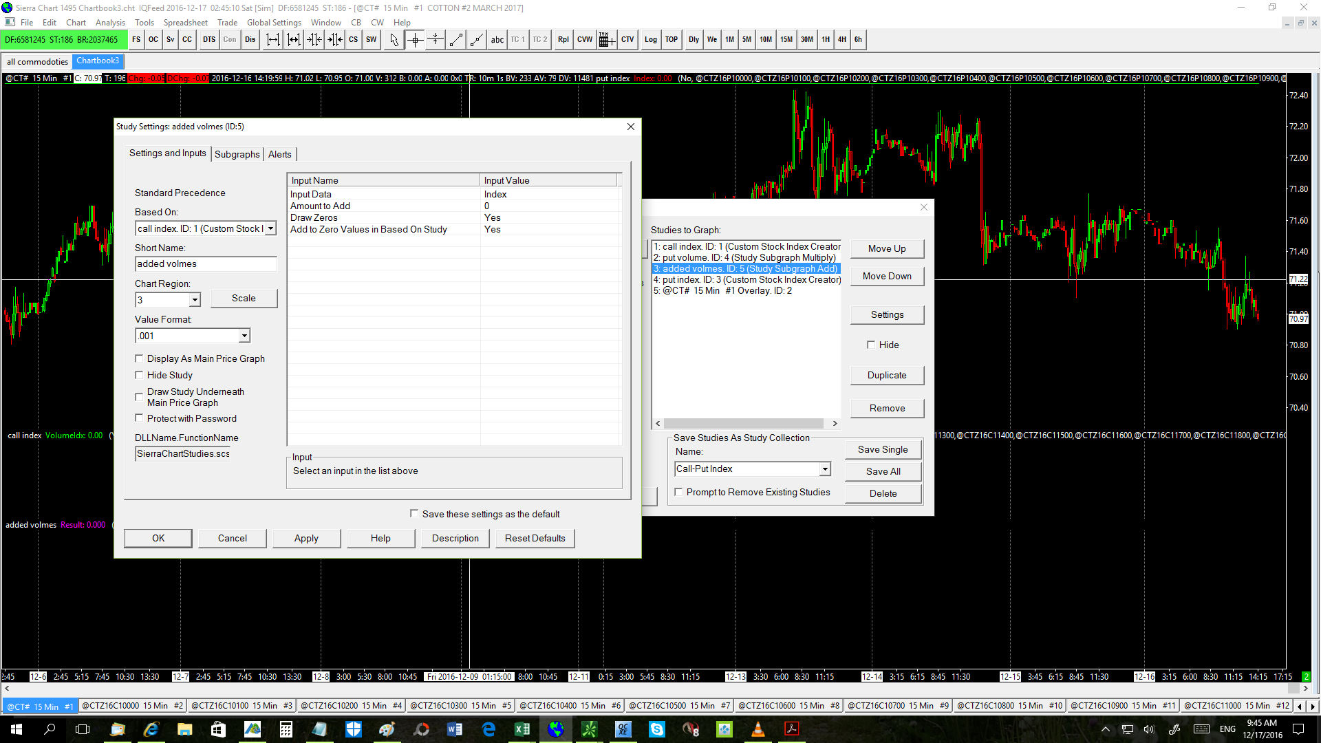 yes, please see image 1 i got all 5 studies as you said but the instruction on "Study Subgraphs Add: Short Name: Added Volumes, Chart Region 3, Scale: Automatic, Input Study 1: Call Index: Volume, Input Study 2: Put Volume: Result, Offset: 0, Draw Zeros: Yes, Perform Add With Zero Value: Yes. Subgraphs Tab: Purple, Bar, Solid, 2." i didn't find how to do that , Input Study 1: Call Index: Volume, Input Study 2: Put Volume: Result, Offset: 0, are not clear so i don't know if this is right , please see image 2 and in image 3 you can see my chart with out any data. and i'm sending the calls symbols and the puts symbols. |