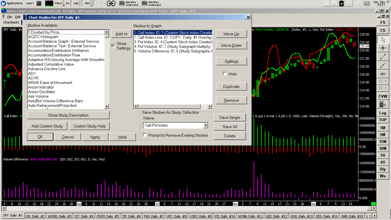 For "Call Index Line" / "Chart Study Number To Overlay", change that to #1. You're on chart #1 and you want to overlay another line from #1 back to itself. For "Put Index", change scaling to Independent. Have a look at "Call Index" and "Put Index", "FLAG Number Of Symbols Found". One says "37" and the other says "33". If I understand your setup correctly, both numbers should be identical. For every call symbol, there should be a matching put symbol. For "Volume Difference", you'll have to double check the settings. I don't know what the numbers translate to. "Input Study 1" should be "Call Index / VolumeIdx". "Input Study 2" should be "Put Volume / Result". Make sure all your studies listed under "Studies To Graph" are in the same order as the instructions in post #19. I think that will get you working. Be sure to hit "Save All" for the Study Collection so you don't have to set all this up again for each major symbol. |