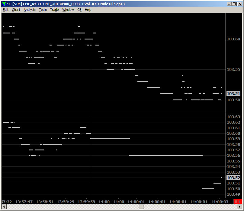 { if (sc.SetDefaults) { // Set the configuration and defaults sc.GraphName = "Milliseconds Example"; sc.AutoLoop = 1; sc.FreeDLL = 0; return; } //When working with milliseconds it is necessary to define variables of type SCDateTimeMS SCDateTimeMS DateTimeMS , DateTimeMSRefChart; // Get the milliseconds for the current bar. Usually this will be 0. This is only an example of how to do it. DateTimeMS = sc.BaseDateTimeIn[sc.Index]; int MilliSecond = DateTimeMS.GetMilliSecond(); //Get the Date-Times from another chart. SCDateTimeArray RefChartDateTime; sc.GetChartDateTimeArray(2, RefChartDateTime ); if(RefChartDateTime.GetArraySize() != 0) { //Get milliseconds for last bar in the other chart being referenced DateTimeMSRefChart = RefChartDateTime[RefChartDateTime.GetArraySize() - 1]; int MilliSecond = DateTimeMSRefChart.GetMilliSecond(); } //Compare the Date-Times from the 2 charts with millisecond precision if(DateTimeMS ==DateTimeMSRefChart) { //There is a match down to the millisecond } } 2. Yes. But to use millisecond precision requires the use of the SCDateTimeMS type. 3. This does depend upon having tick by tick data in the data file. So the Intraday Data Storage Time Unit must be 1 Tick. There can be an issue with historical tick data downloaded from services like IQ Feed but we will solve that. This will be done in the next release. Sierra Chart Support - Engineering Level Your definitive source for support. Other responses are from users. Try to keep your questions brief and to the point. Be aware of support policy: https://www.sierrachart.com/index.php?l=PostingInformation.php#GeneralInformation For the most reliable, advanced, and zero cost futures order routing, *change* to the Teton service: Sierra Chart Teton Futures Order Routing Date Time Of Last Edit: 2013-07-04 07:59:32