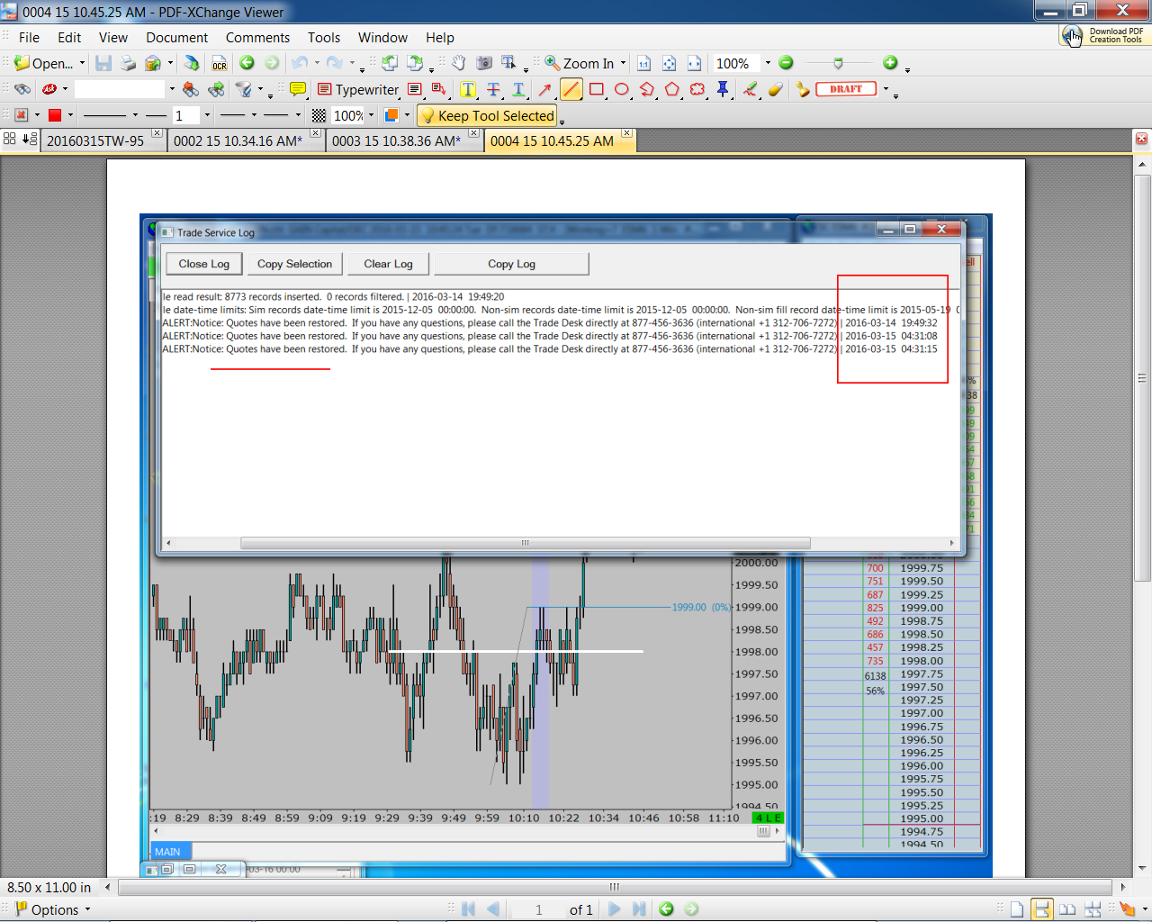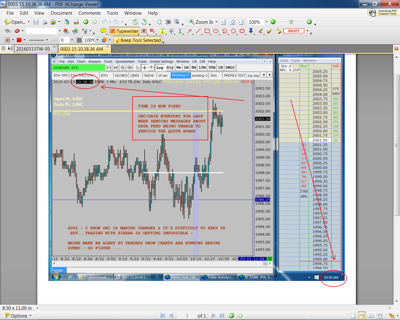 I HAVE OEC/GAIN AS A DATA FEED. I KNOW THEY ARE MAKING CHANGES OVER THERE & IT IS HARD FOR YOU GUYS TO KEEP UP. THEY SAY SOMETIMES THAT THEIR FEED CANNOT SERVICE THE QUOTE BOARD. I DON'T CARE BECAUSE I DON'T USE THE QUOTE BOARD - BUT I DO USE THE CHARTS TO TRADE. DOES THIS ISSUE AFFECT THE CHARTS?? MANY TIMES THE CHARTS ARE RUNNING LATE. SEE IMAGES #1-#2-#3 THIS IS WHAT HAPPENED TODAY. LAST WEEK CHARTS WERE 5 MIN LATE... JUST WANT TO LET YOU KNOW. REJECTED ORDER ISSUE SEEMS TO HAVE BEEN RESOLVED BY RECENT SIERRA UPGRADES - HAD NO ORDER PROBLEMS TODAY. THANX!! |