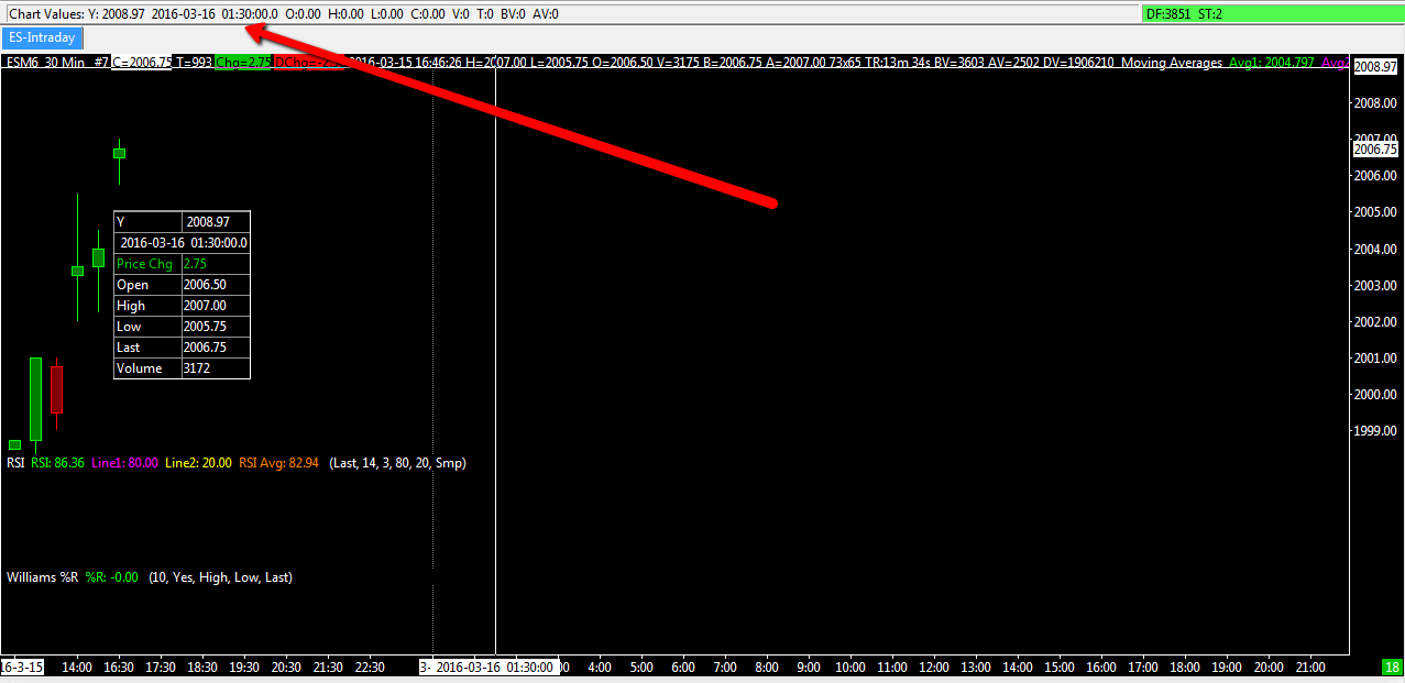 Hi: I was using Sierra version 1253. A feature I really liked was getting the Chart values appearing on the top of my charts as shown in the image below. In particular, I find it very helpful to see the Opening time of the candlestick when the crosshair is clicked on a candlestick . (See red arrow on image attached as a file. Problem 1. I updated to the latest version of Sierra charts on a second machine using the same template as above but I now cannot get the Chart Values to appear above as a Header nor can I get the Opening time of the bar to appear, despite going through the Help section in detail. Please let me know how I can get back this very helpful feature. I do not like it appearing in a window as is seen above since it is disturbing. Problem 2. I rolled over to the current contract and as you can see, the data is totally incomplete. Normally, I go to Delete/ download data and it resolves itself, but this time, no luck. The 120 and 240 minute charts are worse, with barely one or two candles at this time. Why does rollover present such issues? Can you please help resolve these issues. Thank you. Copy of Log below (Message Log removed) Date Time Of Last Edit: 2016-03-16 09:18:24