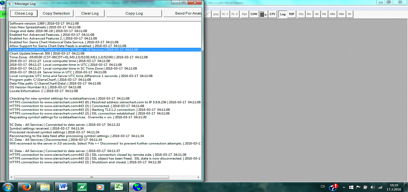 I have just purchased aditional time for using SC, specifically package 5. After opening SC, I have received a log message about the HTTPS connection shut down. I am attaching the complete log out message. Would you please help me resolve this? Is it necessary to do anything with my computer settings perhaps for firewall or something like it? Thank you for your reply. Best regards, Sierra Chart Support |