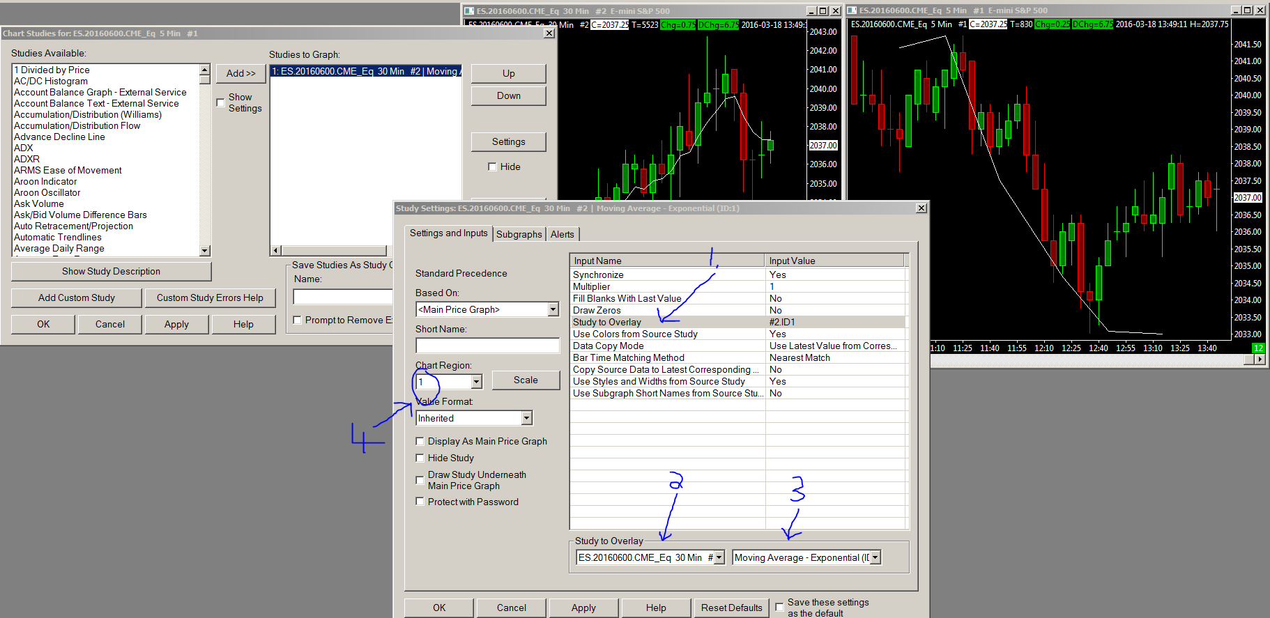 For the example i have here is a 30 minute chart with a 5 EMA and a 5 minute chart that i have a overlay on of the 5 EMA from the 30 minute chart. First off click the ''study/price overlay'' study under studies from your 5 minute chart. Then click on it in the white box. Then once you have it open follow these steps. #1. click on the ''study to overlay'' tab . Then step #2. at the bottom find the 30 minute chart your moving average is on. Then step #3. Click on the moving average you want to overlay . Then step #4 make sure its on chart region 1 .