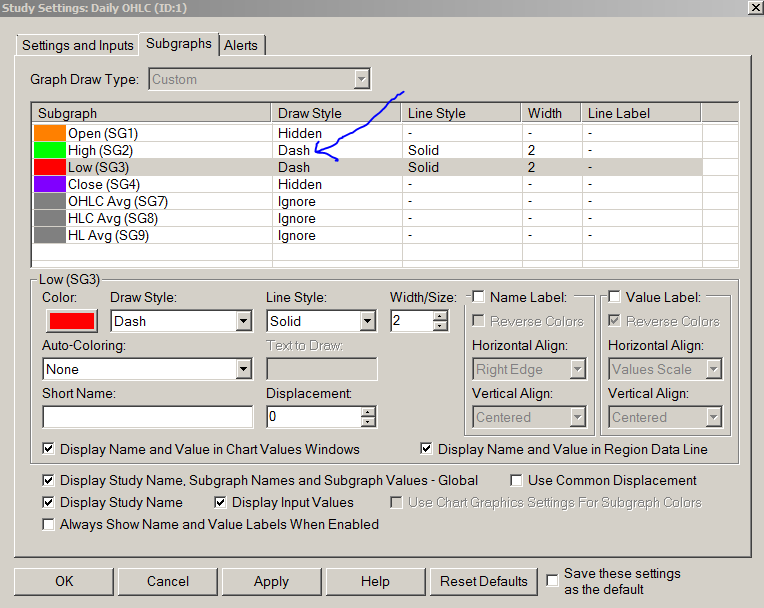 Use the Daily OHLC study: https://www.sierrachart.com/index.php?page=doc/doc_TechnicalStudiesReference.html#s137 As has been said set the Draw Style to "Dash". Sierra Chart Support - Engineering Level Your definitive source for support. Other responses are from users. Try to keep your questions brief and to the point. Be aware of support policy: https://www.sierrachart.com/index.php?l=PostingInformation.php#GeneralInformation For the most reliable, advanced, and zero cost futures order routing, *change* to the Teton service: Sierra Chart Teton Futures Order Routing Date Time Of Last Edit: 2016-03-21 19:19:27