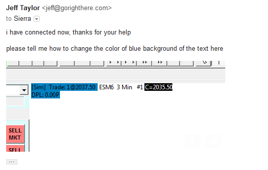 1. Refer to this page here: Customizing Fonts, Colors, Line Styles, and Widths for Chart Trading, Chart DOM, and Trade DOM That particular item is called the "Chart Trade Mode Box". 2. Refer to: https://www.sierrachart.com/index.php?page=doc/doc_GraphicsSettings.html#Fonts 3. Refer to: Graphics Settings https://www.sierrachart.com/index.php?page=doc/doc_Tools.html#ChartValuesToolSettings Sierra Chart Support - Engineering Level Your definitive source for support. Other responses are from users. Try to keep your questions brief and to the point. Be aware of support policy: https://www.sierrachart.com/index.php?l=PostingInformation.php#GeneralInformation For the most reliable, advanced, and zero cost futures order routing, *change* to the Teton service: Sierra Chart Teton Futures Order Routing |