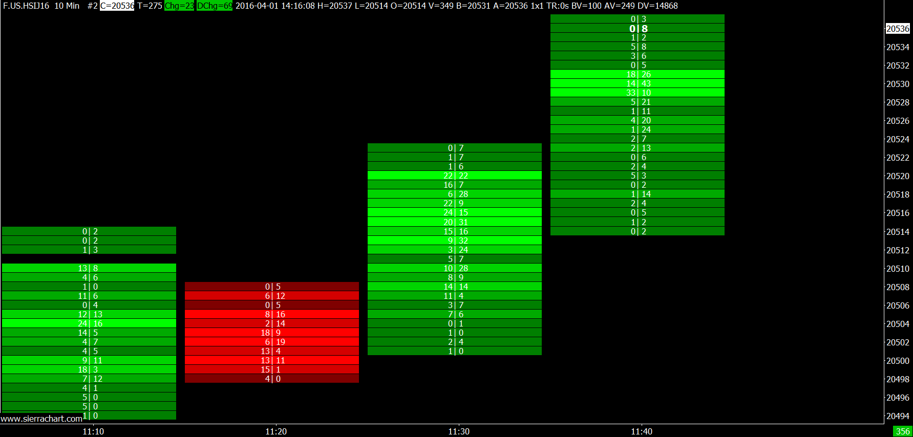 We are now finally able to test this and Sierra Chart is able to create the bid volume and ask volume from the CQG historical tick data: http://www.sierrachart.com/image.php?l=1459534785747.png Those bars were created from historical data. What we want you to do is to go to your HSI chart and re-download the data with Edit >> Delete All Data and Download. After this we need to see the Message Log. Provide a copy of the Message Log by following these instructions: http://www.sierrachart.com/index.php?l=PostingInformation.php#MessageLog Sierra Chart Support - Engineering Level Your definitive source for support. Other responses are from users. Try to keep your questions brief and to the point. Be aware of support policy: https://www.sierrachart.com/index.php?l=PostingInformation.php#GeneralInformation For the most reliable, advanced, and zero cost futures order routing, *change* to the Teton service: Sierra Chart Teton Futures Order Routing |