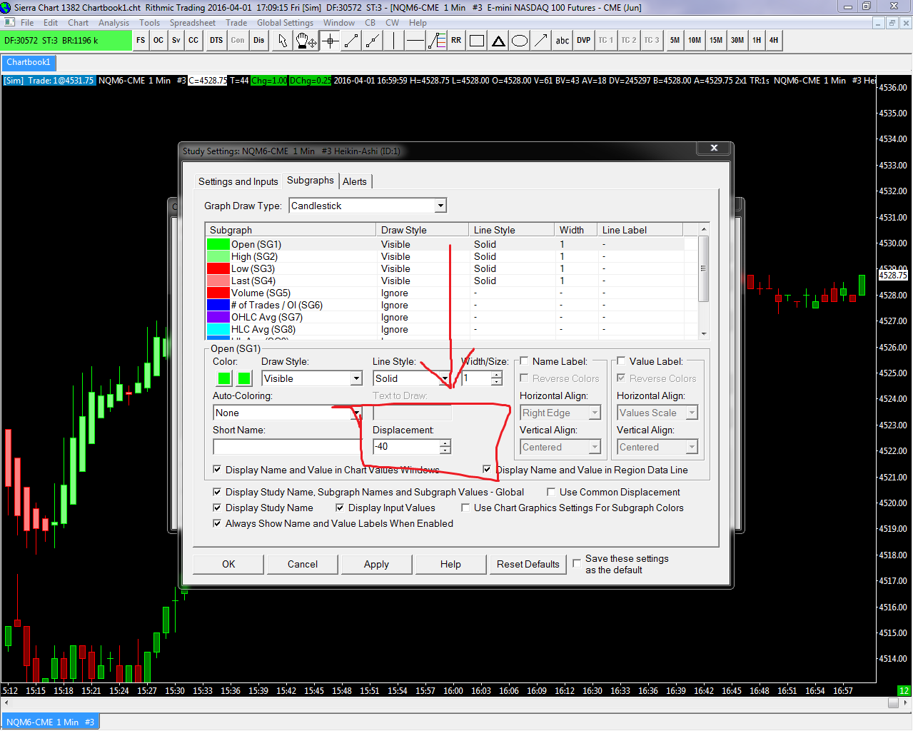 Thanks for the response I should have made the photos better. I attached extra photos for example. I used the displacement on the subgraphs but it only moves the Heikin-Ashi left to right. I'm trying to move it up and down |