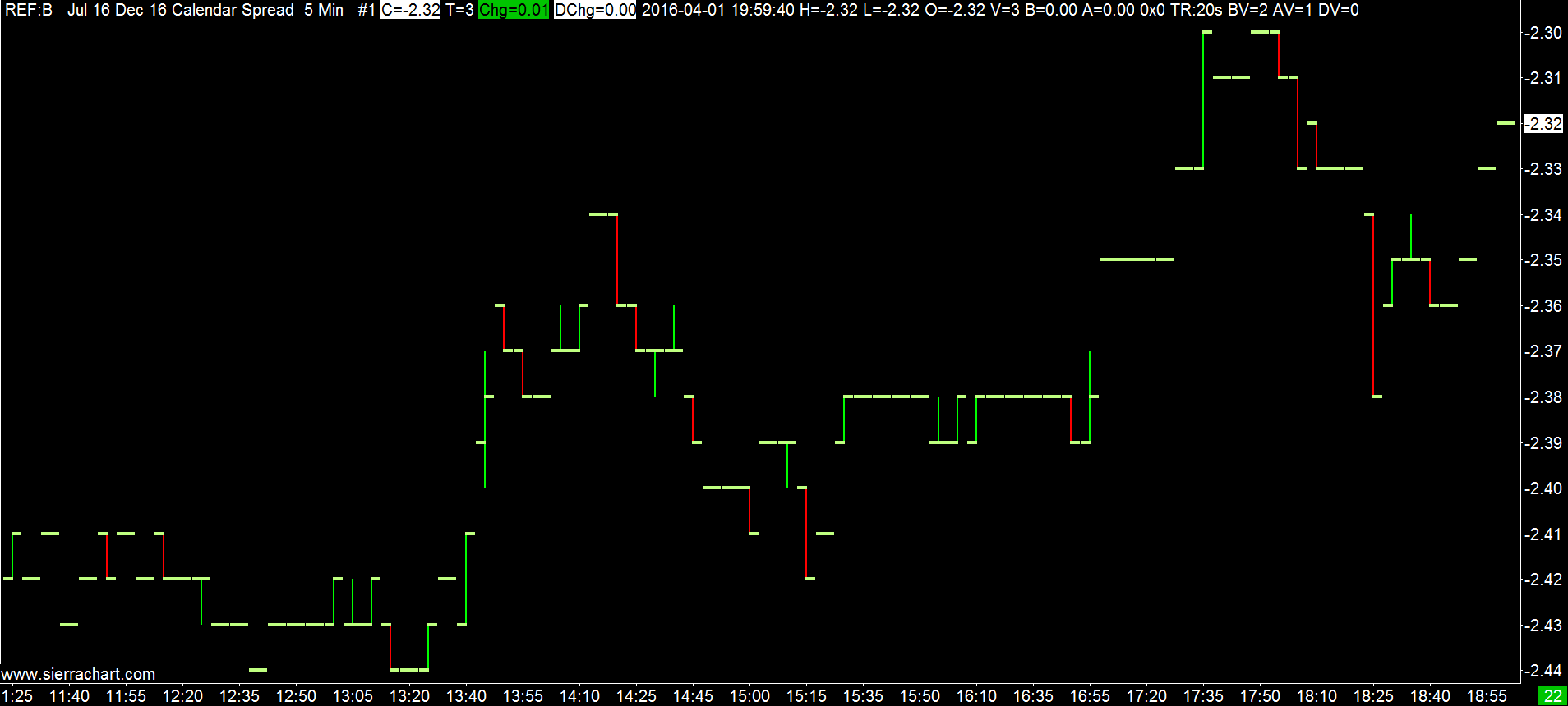 The Easy Screen data feed is not providing current data for this particular spread: http://www.sierrachart.com/image.php?l=145976383424.png The time zone of that chart is UTC and the last received Date-Time is at the top. Sierra Chart Support - Engineering Level Your definitive source for support. Other responses are from users. Try to keep your questions brief and to the point. Be aware of support policy: https://www.sierrachart.com/index.php?l=PostingInformation.php#GeneralInformation For the most reliable, advanced, and zero cost futures order routing, *change* to the Teton service: Sierra Chart Teton Futures Order Routing Date Time Of Last Edit: 2016-04-04 09:58:45