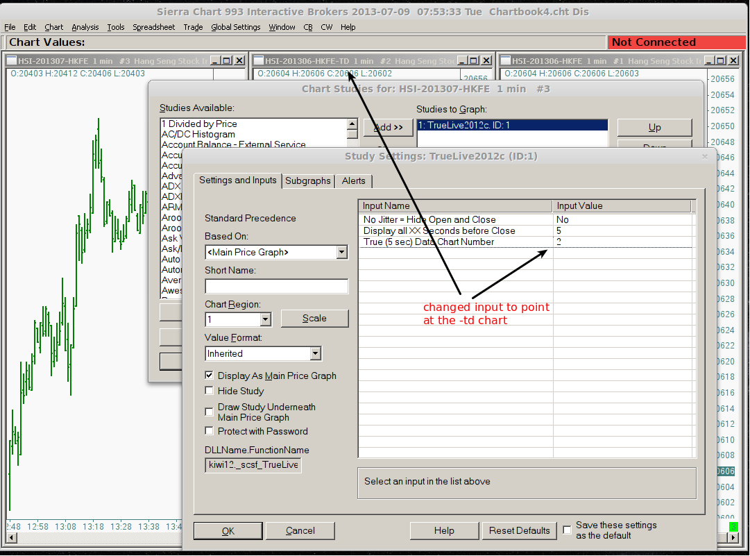 No problem ... we are isolating the issue. If I go >> file >> open intraday chart and type in HSI-201307-HKFE then Sierra will collect the live data feed from IB If I now do the same but instead enter HSI-201307-HKFE-TD Sierra will request the 5 second "true data" feed from IB They are two completely different feeds and you need to open both charts to have both feeds being collected. So, start by getting live data and true data. Then follow the instructions above. Experiment with your -TD and your live charts ... check them out ... Note that when you backfill a live chart you actually get the same data as on a TD chart so there are no errors. To see the difference you must look at live corrected data vs backfilled or TD collected data. Before I built TrueLive I used to backfill my bars every 5 or 10 minutes or at critical points to be sure the bars were correct --- a total p.i.t.a Also note that IB's live data sends a packet every 1/10th second so if there is only one price in 1/10th of a second it will be correct. Its only wrong when 2 or more different prices happen and you only see the error if one of them makes the OHL or C of the bar you are examining. Its funny how often swing highs or daily highs/lows occur on fast action and that critical tick can be missing from live data though. ############ Note: -TD charts will stop updating if there is no data for a period (more than 5 minutes but not sure exactly how long) so with HSI which opens at 11:15 and has a lunch break from 2:00 to 3:00 I make sure I disconnect and reconnect Sierra in the last 5 minutes before the session opens. This shouldn't be necessary for continuously open contracts but if you ever discover your -TD feed isn't updating disconnect and reconnect Sierra ( Ctrl-F11 then F11 ). Date Time Of Last Edit: 2013-07-08 23:25:02