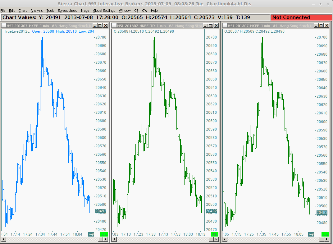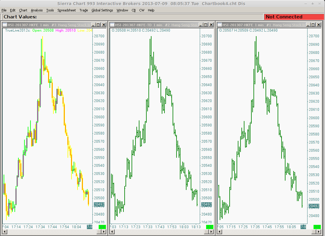 Notes: Statically this is working. You can see errors on the right most chart (gap around 20530 and loss of highs in consolidation at 20630) that are corrected in the left most chart to match the -td in the middle. I will test it on real time updates when hsi opens. When running live the blue chart will get its bar opening with the first tick of the new minute but the td middle chart won't start until 5 seconds in when the first bar arrives. Where the live data is incorrect it will be corrected as soon as TD "fixes" it. I originally wrote true live, years back, because I care about bar highs and lows and needed to be sure. The Sierra Team have created a correction for data but it can't work perfectly because it is building bars in the .SCID file and the late arrival of TD will result in occasional errors. Its better but it can't be perfect. So the only way to get "perfect" charts is to collect both live and true data then use a function to create a chart that combines them after the td corrections arrive. I also created livetrue so that you could add realtime information to td charts. I did this because the Volume at Price study uses the underlying's data for volume and the -td volume is much more accurate than the live volume. Because the function uses the underlying you must run it on a -td chart to get an "accurate" volume profile. Hence livetrue. But get true live running to your satisfaction before you mess with livetrue. HSI is pretty much the fastest nastiest contract out there and I have never had a problem with IB data representing price action. It has NO lag. It is accurate with live and 5 second data are combined. But if you want "accurate" tick or volume charts then you must invest in another data feed. Personally I find time charts with correct suport and resistance, supply and demand areas, all that you need to trade so I'm more than happy with this. You could create a version of livetrue that ran other chart forms on the -td chart and corrected them for the real time information (last 5 seconds of information) but I've never done that. It actually might be interesting if there is a real interest in it from a number of people. Hmmm :) Date Time Of Last Edit: 2013-07-08 22:26:45