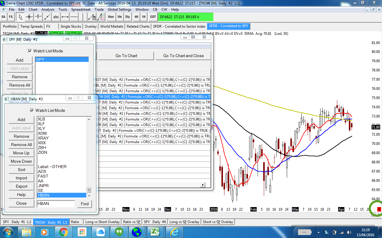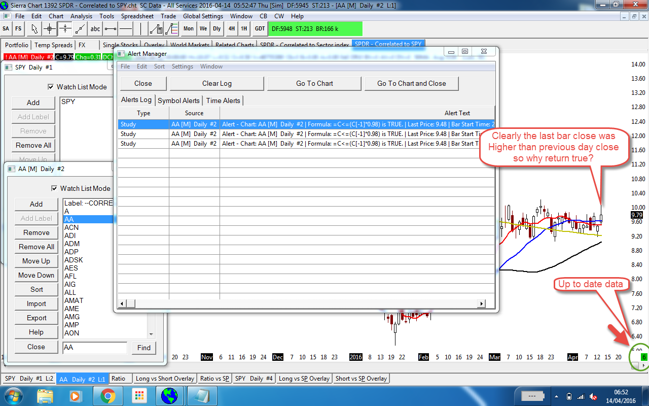 We do not think there is a problem here. And also apparently you did not take note of all of the information in post #2. Maybe when you read that post all of the information was not there. We need some time to prepare documentation to explain how all of this works. There is one potential problem that we do need to address but it does not appear to be relevant in this particular case. This is what we want you to do: -Restart Sierra Chart. -Run the scan for all your symbols on a Historical Daily chart. -Select Window >> Alerts Manager >> Alerts Log >> Clear Log. -Run the scan again. At this point in time, the scan will only be on the most recent bar since no download will have occurred during the second scan. When a download occurs, there will be two evaluations: On what is the last bar in the chart before the download, and the new last bar after the download. Sierra Chart Support - Engineering Level Your definitive source for support. Other responses are from users. Try to keep your questions brief and to the point. Be aware of support policy: https://www.sierrachart.com/index.php?l=PostingInformation.php#GeneralInformation For the most reliable, advanced, and zero cost futures order routing, *change* to the Teton service: Sierra Chart Teton Futures Order Routing Date Time Of Last Edit: 2016-04-14 08:30:38