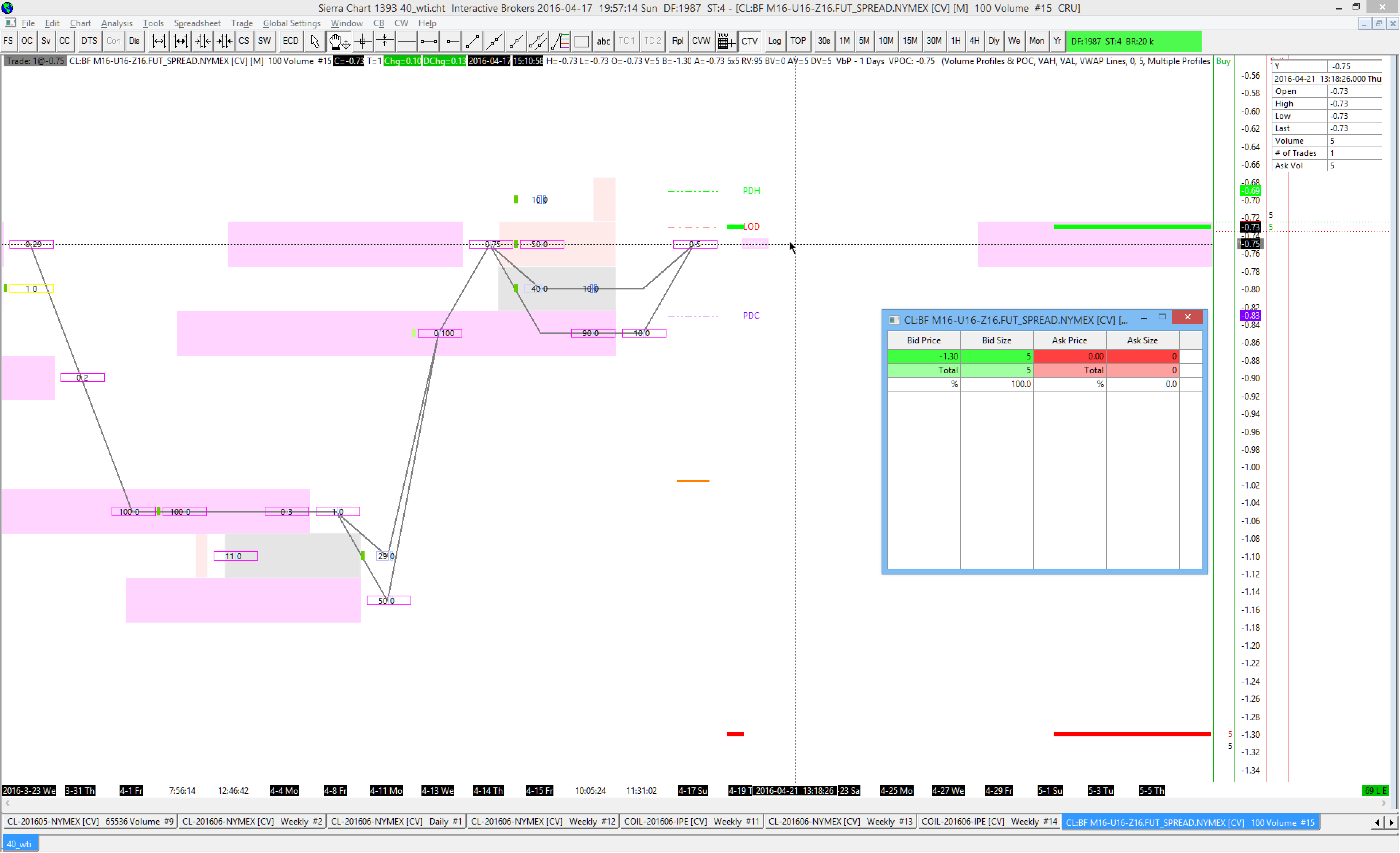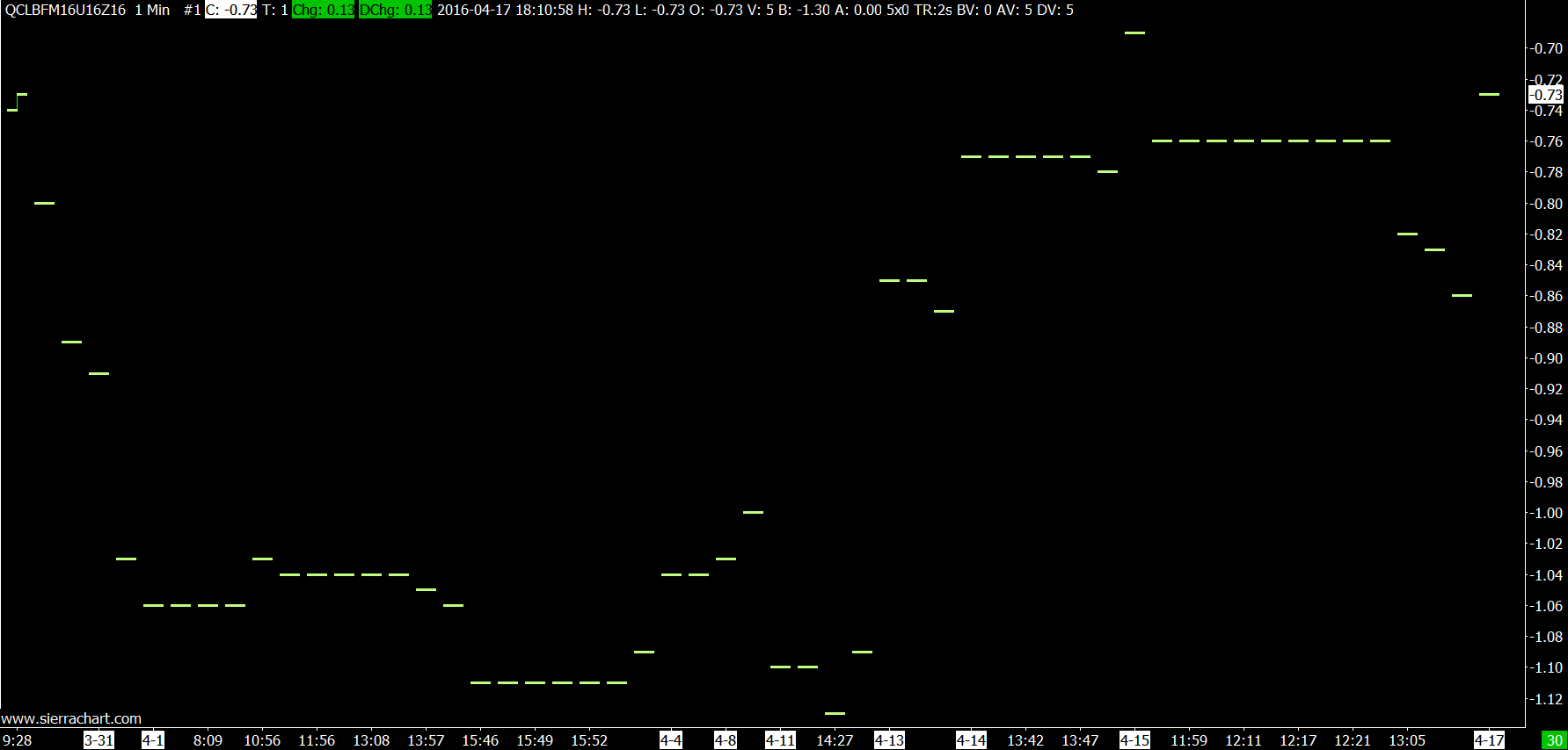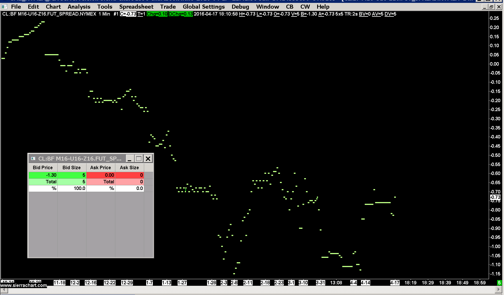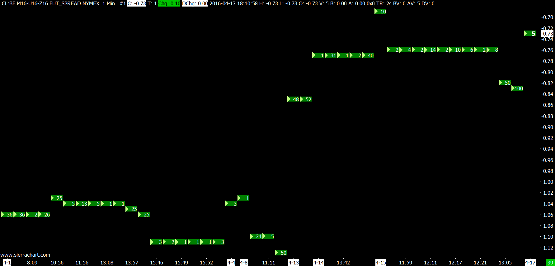 Attaching a chart here incorrectly showing the last trade at -0.75 (it wasn't, it was -0.73 - because it was my actual trade). Additionally, the DOM seems to be reflecting stale quotes as the current ask (being flashed on and off) is -0.80, not -0.73 (which was my offer before it got filled) and a best bid of -0.87. A non-number bars study shows the trade at -0.73, the problem here is with number bars (and the stale quotes in the DOM). The fact that I'm seeing totally old data on the DOM makes me wonder how live this data even is. Also, the tick data only goes back to 3/23, meaning less than 3 weeks of actual data - but I know these spreads within SC have been available for quite a few months now. Where's the older data? There's prints on this spread all the way back to October of 2014, so it's not an issue of it not trading then. I don't expect SC to have data all the way back then, but I do expect it to have data older than 3 weeks. |