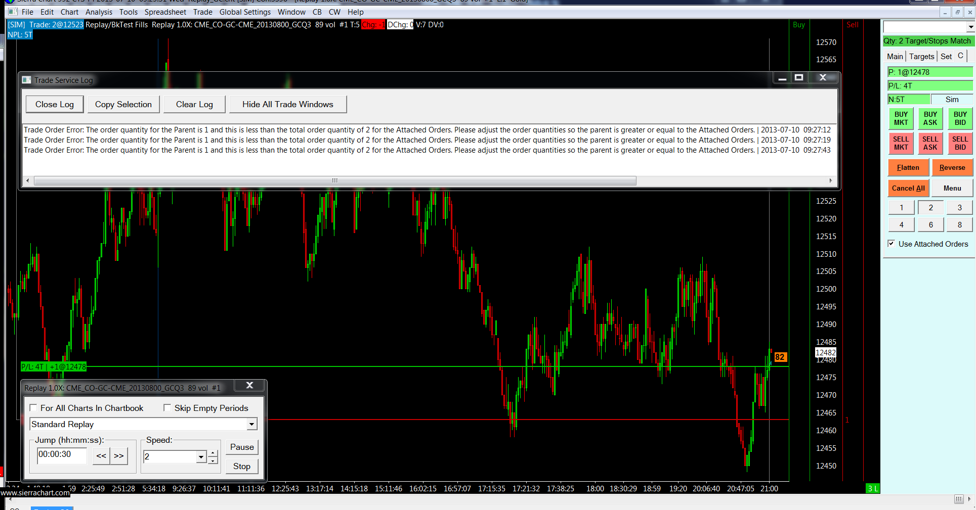 I did a replay here. and the error message occured in the following situation: 1. I went long 2 contracts with attached orders for stoploss and profit targets. 2. one of the profit target is hit, and I'm now left with 1 contract long and its stoploss and profit target. 3. I then tried to go short 2 contracts. and got the error message. here is the screenshot. http://www.sierrachart.com/image.php?l=1373416175819.png last time when I was trading sim with live feed, it wouldn't allow me to add to my long position. but this time when I was replaying, it wouldn't allow me to reverse when I had 1 long contract left. I really don't get this. and I'm worried about going live trading real money with it. Date Time Of Last Edit: 2013-07-10 00:41:48