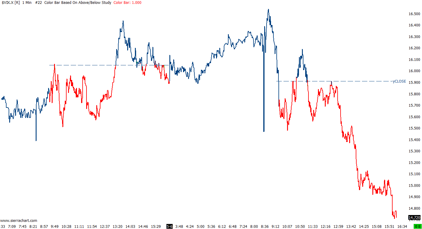 I have a chart(called it chart#1) of the vix where I use color bar based on Above/Below based on the previous close. I would like to overlay this chart(chart#2) with the color condition on a separate chart using study/price overlay. When I do,the color condition does not show on the chart#2. IS there a way to do this? thanks http://www.sierrachart.com/image.php?Image=1462636409756.png |